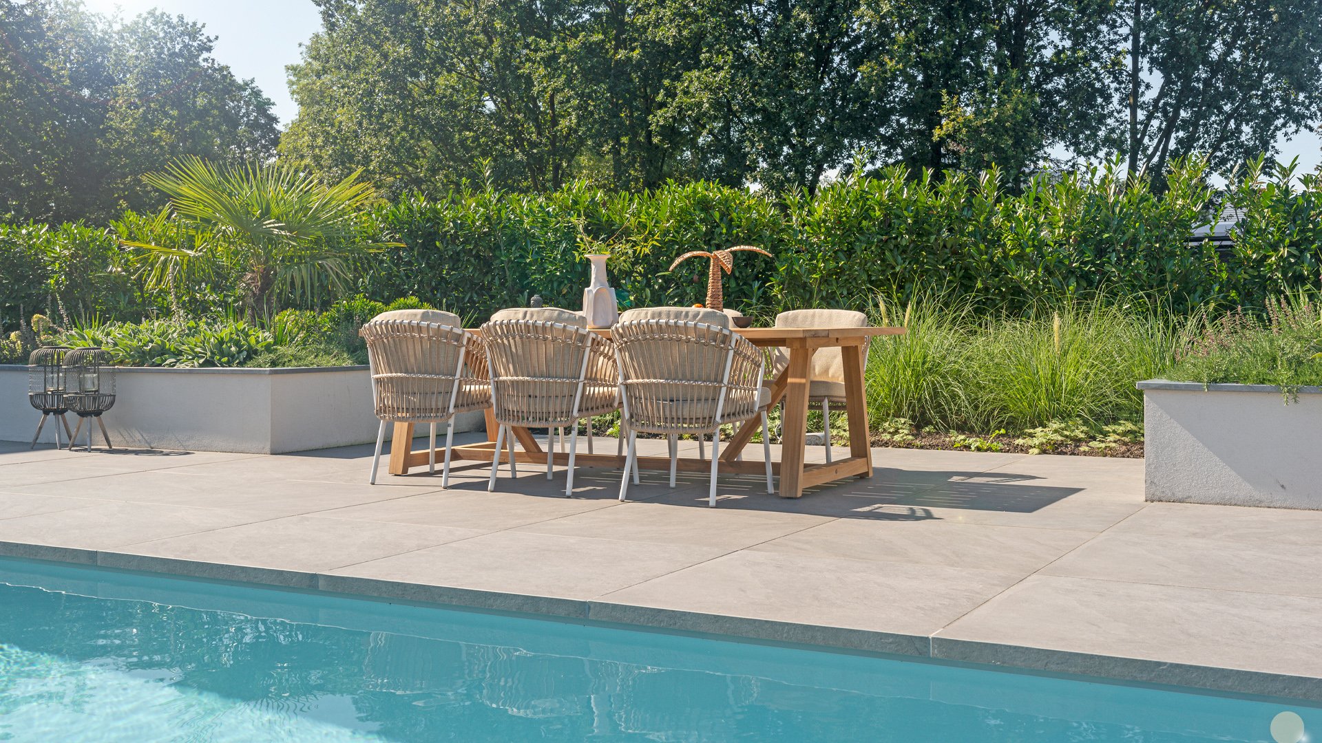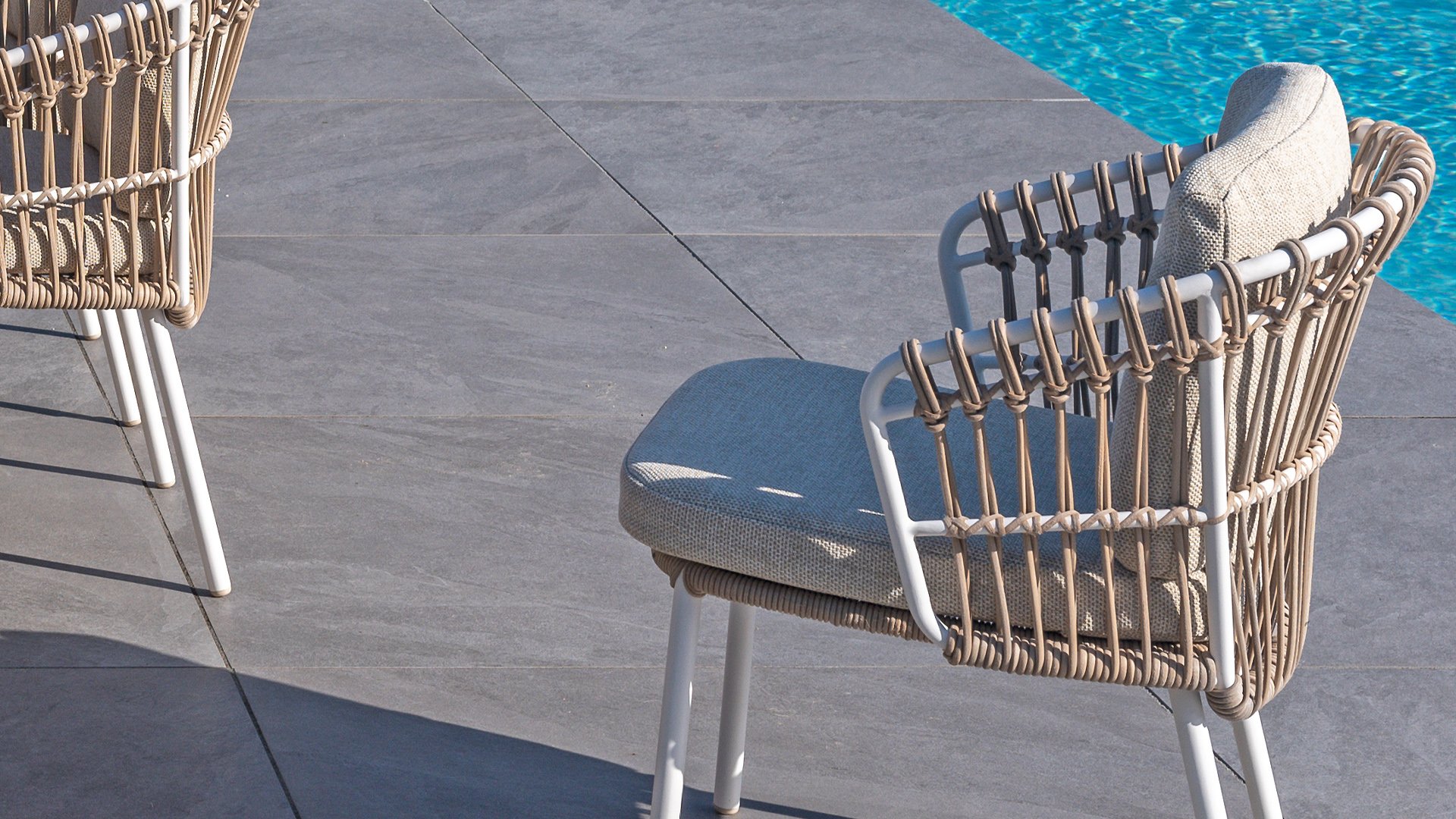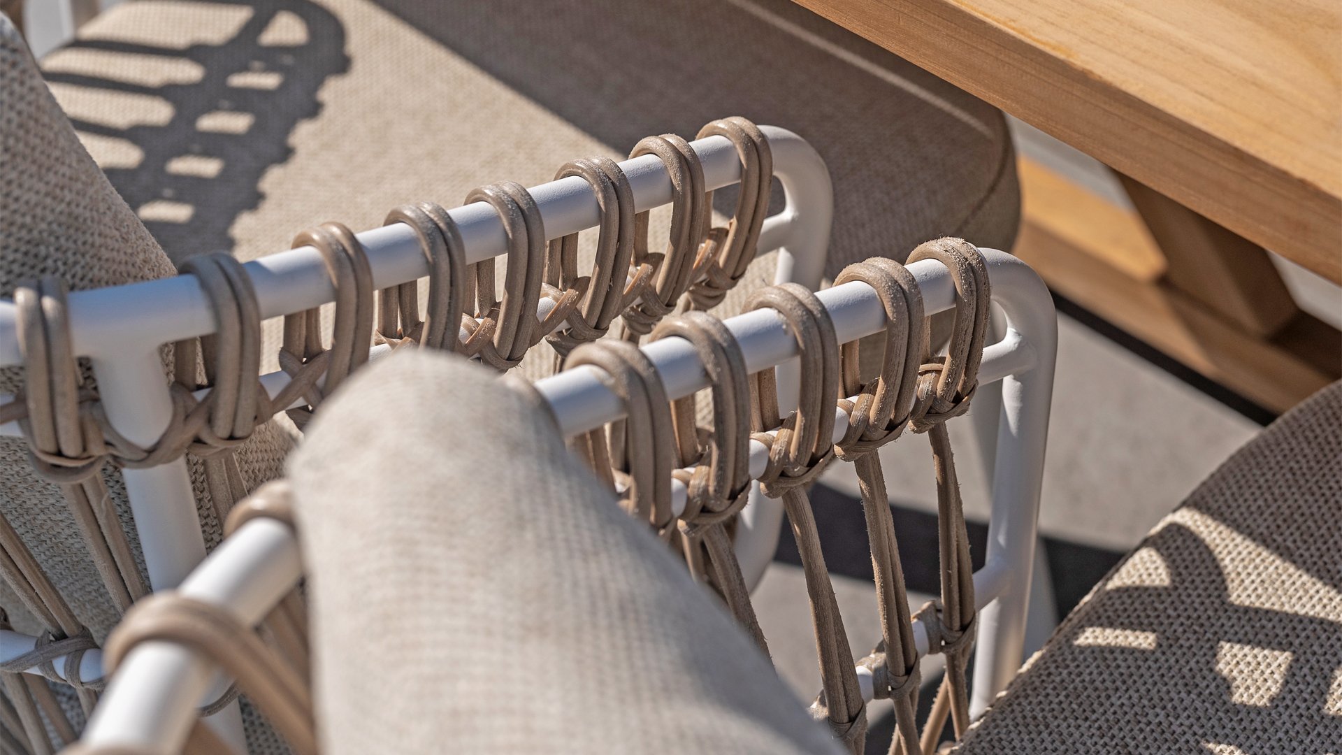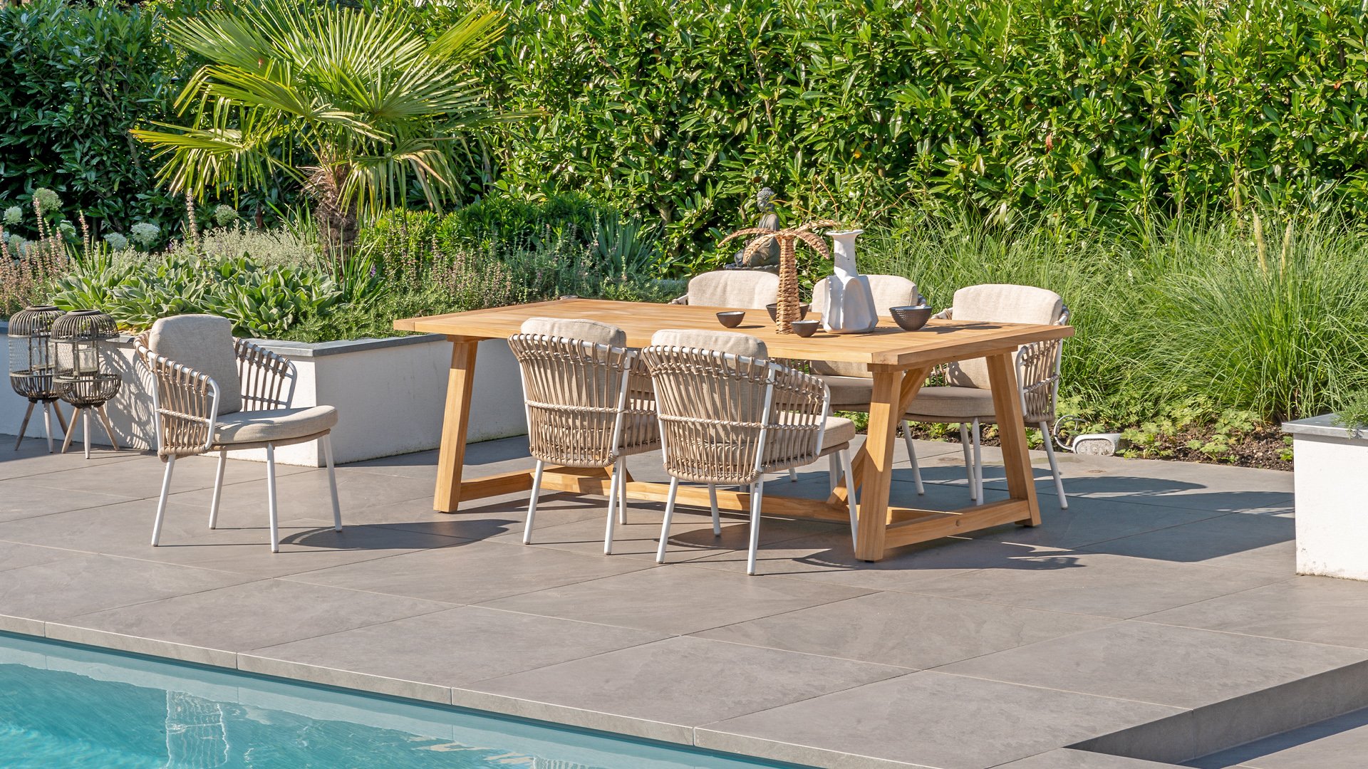 White dahlias on the beach Close your eyes and imagine yourself in Ibiza. The summery atmosphere that the Dalias series exudes with its white frame and taupe braided work instantly gives your garden a sunny boost. If you love summer, then you love Dalias.