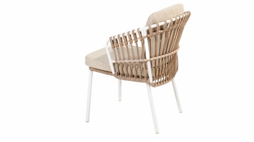 Discover ultimate comfort and contemporary elegance with the 4 Seasons Outdoor Dalias dining chair. This chair comes with cushions and has refined taupe braided work and a radiant white stainless steel frame. Here are some features that make this chair an absolute favorite: