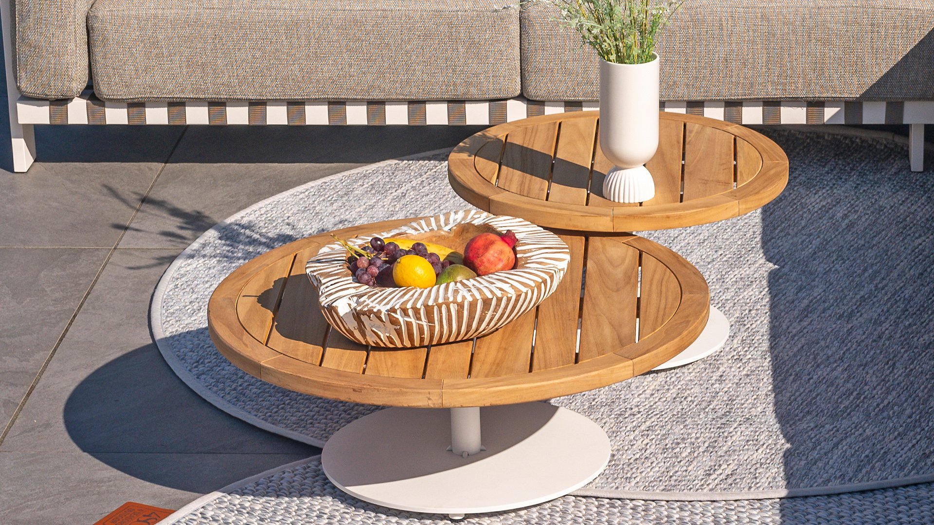 Discover the beauty and versatility of the 4 Seasons Outdoor Volta round coffee table with its beautiful teak table top and stainless steel frame. The Volta table series consists of 3 sizes and 3 colors: Anthracite, White, Latte. This table adds a touch of natural elegance to your outdoor space and is designed with attention to detail.