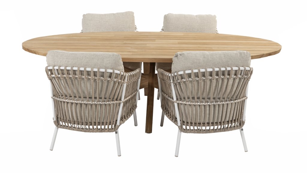 The Taste by 4Seasons Prado Ellips can be called a work of art. Just look at how artfully that set of legs fits together. The thick teak wood top has an angled edge and gives the table an airy feel. Can be combined with our entire collection of garden chairs.