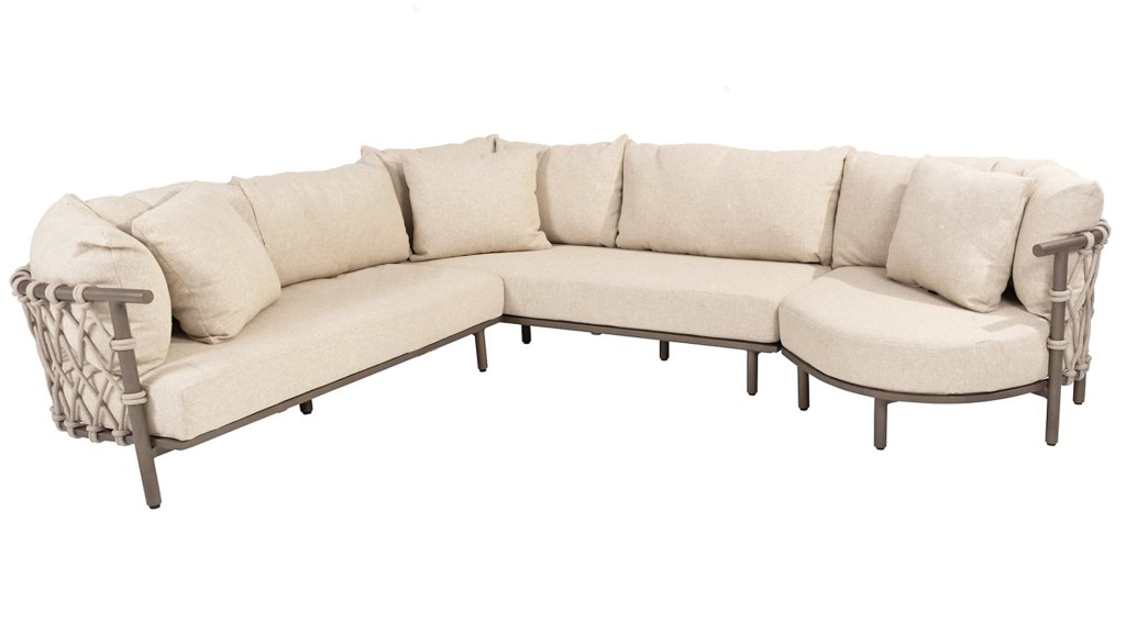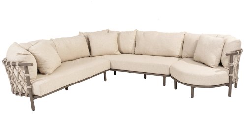 Experience ultimate comfort and stylish elegance with the Ezra lounge from 4 Seasons Outdoor. This beautiful lounge set, finished in an elegant Terre color, features a stunning design that perfectly fits modern gardens. The fully aluminum frame is designed with sublime curves, while the thick lounge cushions provide a delightful contrast and optimal comfort. Combined with the thick Rope, it's a beautiful set!