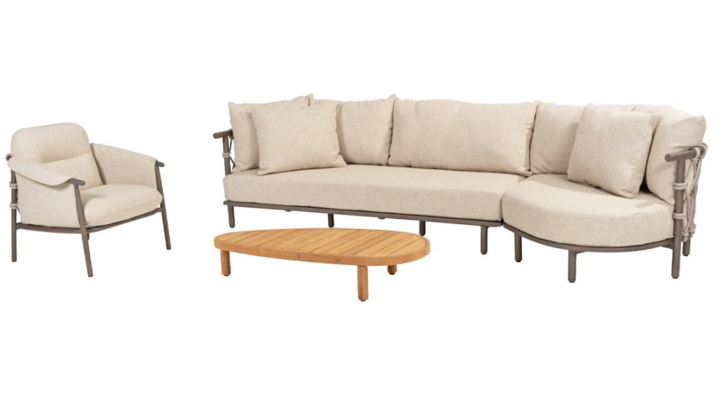 Experience ultimate comfort and stylish elegance with the Ezra lounge from 4 Seasons Outdoor. This beautiful lounge set, finished in an elegant Terre color, features stunning design that perfectly fits contemporary gardens. The fully aluminum frame is designed with sublime curves, while the thick lounge cushions provide a wonderful contrast and optimal comfort. Combined with the thick Rope, it's a beautiful set!