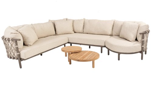Experience ultimate comfort and stylish elegance with the Ezra lounge from 4 Seasons Outdoor. This beautiful lounge set, rendered in an elegant Terre color, features stunning design that perfectly complements contemporary gardens. The fully aluminum frame is designed with sublime curves, while the thick lounge cushions provide a wonderful contrast and optimal comfort. Combined with the thick Rope, it's a beautiful set!
