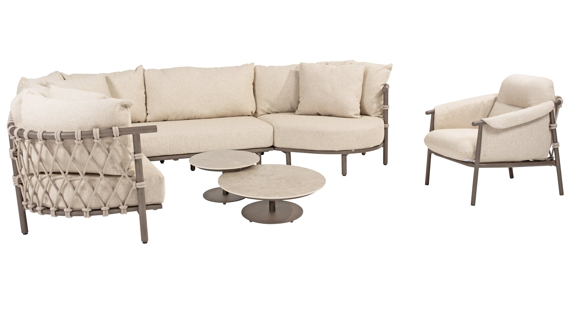 Experience ultimate comfort and stylish elegance with the Ezra lounge from 4 Seasons Outdoor. This beautiful lounge set, finished in an elegant Terre color, features a stunning design that perfectly fits modern gardens. The fully aluminum frame is designed with sublime curves, while the thick lounge cushions provide a delightful contrast and optimal comfort. Together with the thick Rope, this is a stunning set!