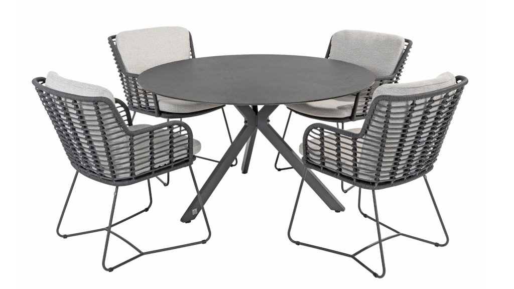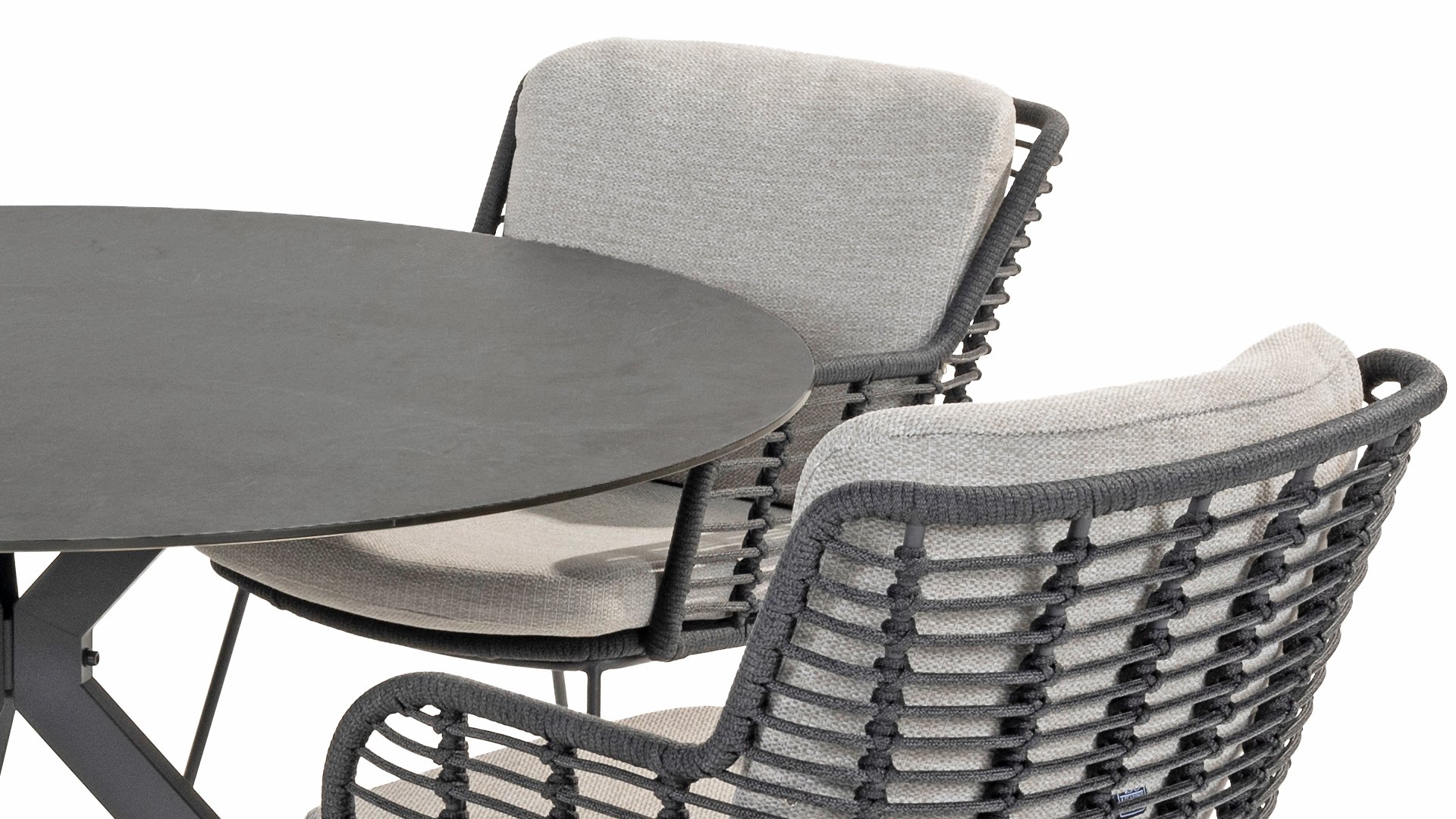 Made from the best materials, crafted with passion. This beautiful 4Seasons Fabrice dining series not only has flair but also excellent seating comfort. The chair is also available in the following colors: Anthracite, Latte and Terre. The materials used are synthetic rope, olefin & aluminum. Synthetic rope has a core that ensures color fastness and makes it mold-resistant. Olefin also makes the cushions color fast and water-resistant, and the fabric feels comfortable. The frame of the Fabrice is powder-coated aluminum to complete the sleek design! Also available in lounge: 4SO Fabrice Corner Lounge Set & 4SO Fabrice Lounge Set.