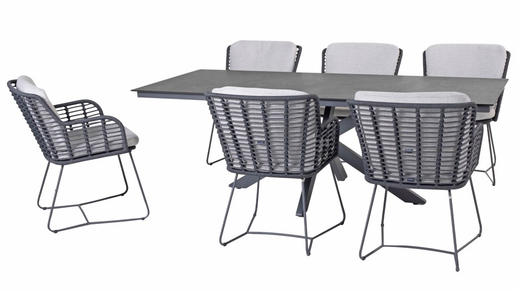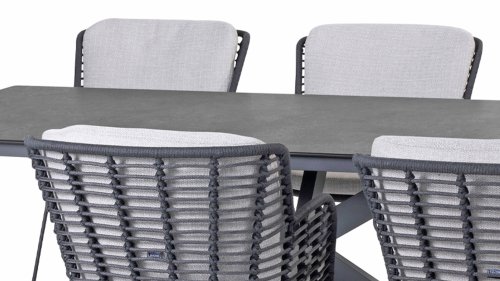 Made from the best materials, crafted with passion. This beautiful 4Seasons Fabrice dining series not only has flair but also excellent seating comfort. The chair is also available in the following colors: Anthracite, Latte and Terre. The materials used are synthetic rope, olefin & aluminum. Synthetic rope has a core that ensures color fastness and makes it mold-resistant. Olefin also makes the cushions color fast and water-resistant, and the fabric feels comfortable. The frame of the Fabrice is powder-coated aluminum to complete the sleek design! Also available in lounge: 4SO Fabrice Corner Lounge Set & 4SO Fabrice Lounge Set.