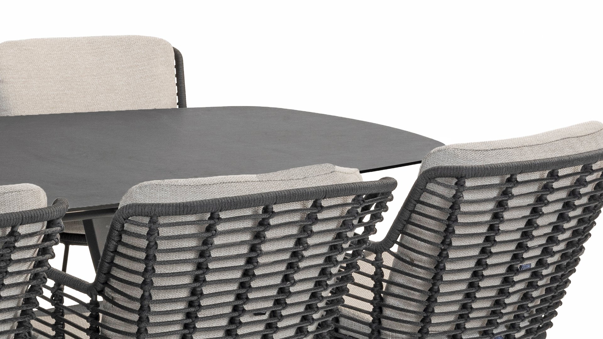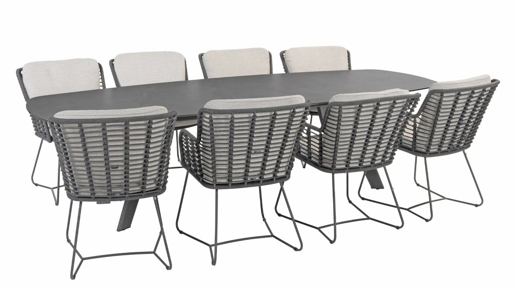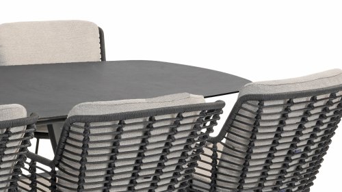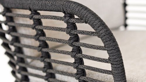 Made from the best materials, crafted with passion. This beautiful 4Seasons Fabrice dining series not only has flair but also excellent seating comfort. The chair is also available in the following colors: Anthracite, Latte and Terre. The materials used are synthetic rope, olefin & aluminum. Synthetic rope has a core that ensures color fastness and makes it mold-resistant. Olefin also makes the cushions color fast and water-resistant, and the fabric feels comfortable. The frame of the Fabrice is powder-coated aluminum to complete the sleek design! Also available in lounge: 4SO Fabrice Corner Lounge Set & 4SO Fabrice Lounge Set.