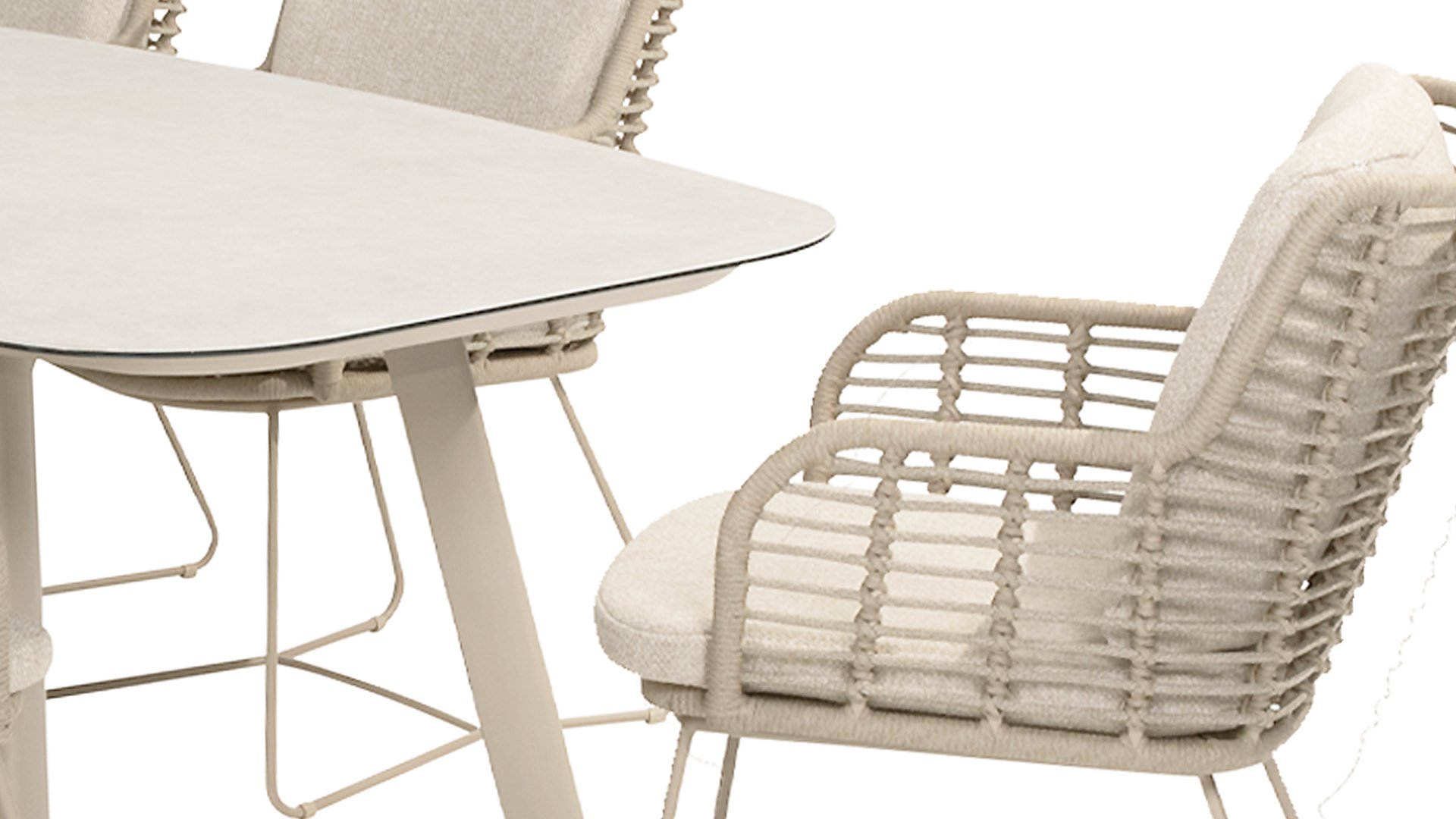 This beautiful material is perfect for outdoor use, because 4SO Rope is not just an shoelace. Our round wires have a synthetic core. This polypropylene base ensures minimal stretching of the rope and also does not absorb moisture. The covering is made of an acrylic fabric, similar to the weather-resistant fabric of our garden cushions. This covering feels soft but is highly water-repellent, UV-resistant, and colorfast. The flat rope variants have the same mix of weather-resistant materials, but the polypropylene material is interwoven with the acrylic fabric. This technique gives the flat rope the same properties but a completely different look. The stretch is minimal, and 4 Seasons Outdoor garden furniture with Rope is suitable for people weighing up to 110 kg. It's therefore an exceptionally strong material, but it's important to be careful with sharp objects. Our Rope is weather-resistant, but a sharp object can seriously damage your garden furniture. We offer exclusive designs using hand-woven Rope patterns and techniques.