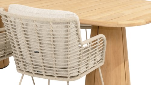 This beautiful material is perfect for outdoor use, because 4SO Rope is not just an shoelace. Our round wires have a synthetic core. This polypropylene base ensures minimal stretching of the rope and also does not absorb moisture. The covering is made of an acrylic fabric, similar to the weather-resistant fabric of our garden cushions. This covering feels soft but is highly water-repellent, UV-resistant, and colorfast. The flat rope variants have the same mix of weather-resistant materials, but the polypropylene material is interwoven with the acrylic fabric. This technique gives the flat rope the same properties but a completely different look. The stretch is minimal, and 4 Seasons Outdoor garden furniture with Rope is suitable for people weighing up to 110 kg. It's therefore an exceptionally strong material, but it's important to be careful with sharp objects. Our Rope is weather-resistant, but a sharp object can seriously damage your garden furniture. We offer exclusive designs using hand-woven Rope patterns and techniques.
