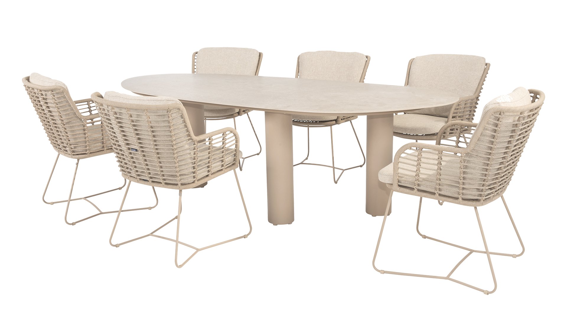 This beautiful material is perfect for outdoor use, because 4SO Rope is not just an shoelace. Our round wires have a synthetic core. This polypropylene base ensures minimal stretching of the rope and also does not absorb moisture. The covering is made of an acrylic fabric, similar to the weather-resistant fabric of our garden cushions. This covering feels soft but is highly water-repellent, UV-resistant, and colorfast. The flat rope variants have the same mix of weather-resistant materials, but the polypropylene material is interwoven with the acrylic fabric. This technique gives the flat rope the same properties but a completely different look. The stretch is minimal, and 4 Seasons Outdoor garden furniture with Rope is suitable for people weighing up to 110 kg. It's therefore an exceptionally strong material, but it's important to be careful with sharp objects. Our  Rope is weather-resistant, but a sharp object can seriously damage your garden furniture. We offer exclusive designs using hand-woven Rope patterns and techniques.