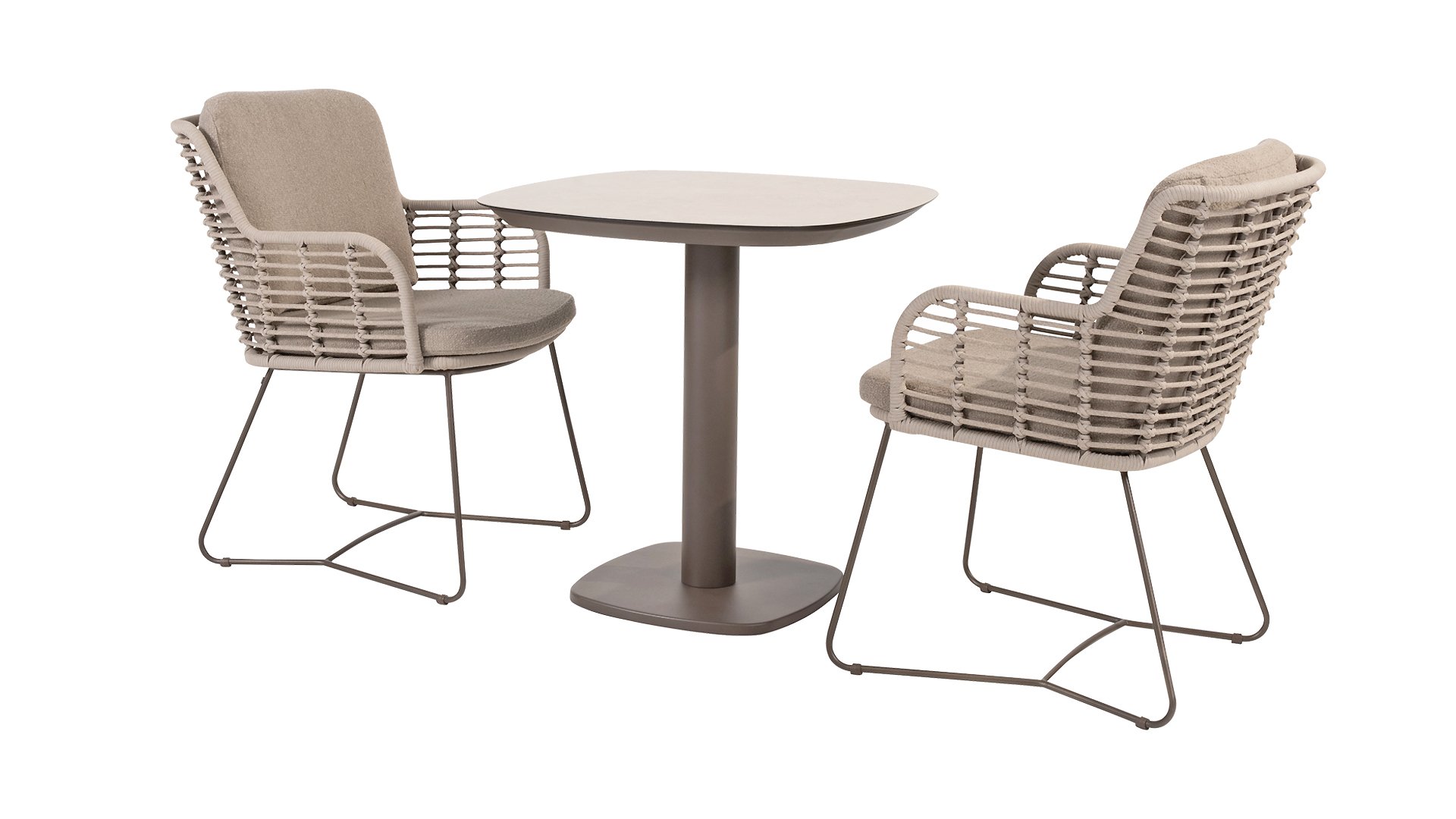 Made from the best materials, crafted with passion. This beautiful 4Seasons Fabrice dining series not only has flair but also excellent seating comfort. The chair is also available in the following colors: Anthracite, Latte and Terre. The materials used are synthetic rope, olefin & aluminum. Synthetic rope has a core that ensures color fastness and makes it mold-resistant. Olefin also makes the cushions color fast and water-resistant, and the fabric feels comfortable. The frame of the Fabrice is powder-coated aluminum to complete the sleek design! Also available in lounge: 4SO Fabrice Corner Lounge Set & 4SO Fabrice Lounge Set.