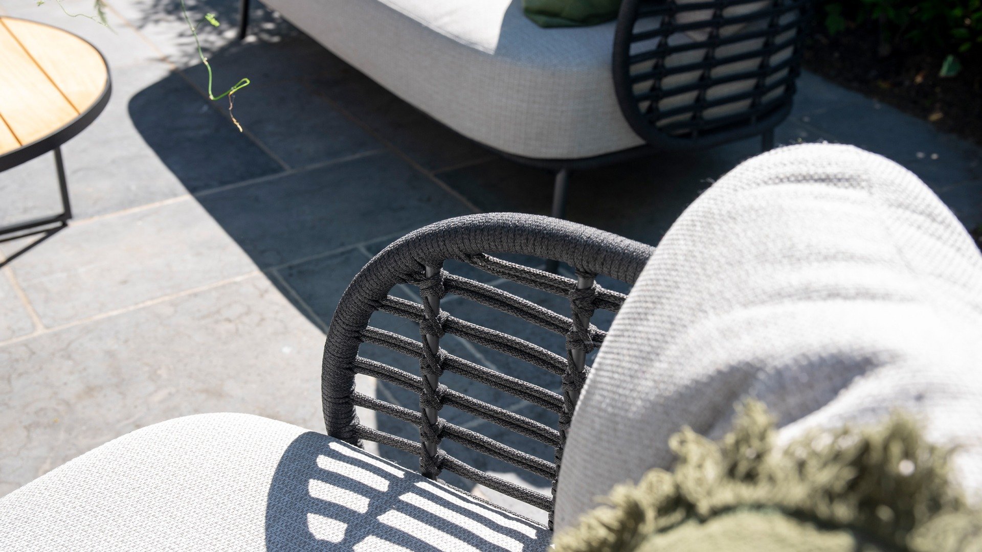 This beautiful material is perfect for outdoor use, because 4SO Rope is not just an shoelace. Our round wires have a synthetic core. This polypropylene base ensures minimal stretching of the rope and also does not absorb moisture. The covering is made of an acrylic fabric, similar to the weather-resistant fabric of our garden cushions. This covering feels soft but is highly water-repellent, UV-resistant, and colorfast. The flat rope variants have the same mix of weather-resistant materials, but the polypropylene material is interwoven with the acrylic fabric. This technique gives the flat rope the same properties but a completely different look. The stretch is minimal, and 4 Seasons Outdoor garden furniture with Rope is suitable for people weighing up to 110 kg. It's therefore an exceptionally strong material, but it's important to be careful with sharp objects. Our  Rope is weather-resistant, but a sharp object can seriously damage your garden furniture. We offer exclusive designs using hand-woven Rope patterns and techniques.
