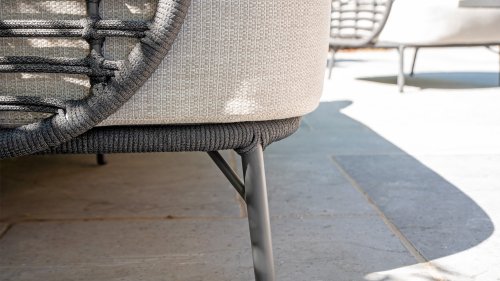 This beautiful material is perfect for outdoor use, because 4SO Rope is not just an shoelace. Our round wires have a synthetic core. This polypropylene base ensures minimal stretching of the rope and also does not absorb moisture. The covering is made of an acrylic fabric, similar to the weather-resistant fabric of our garden cushions. This covering feels soft but is highly water-repellent, UV-resistant, and colorfast. The flat rope variants have the same mix of weather-resistant materials, but the polypropylene material is interwoven with the acrylic fabric. This technique gives the flat rope the same properties but a completely different look. The stretch is minimal, and 4 Seasons Outdoor garden furniture with Rope is suitable for people weighing up to 110 kg. It's therefore an exceptionally strong material, but it's important to be careful with sharp objects. Our  Rope is weather-resistant, but a sharp object can seriously damage your garden furniture. We offer exclusive designs using hand-woven Rope patterns and techniques.