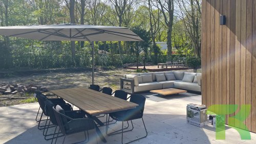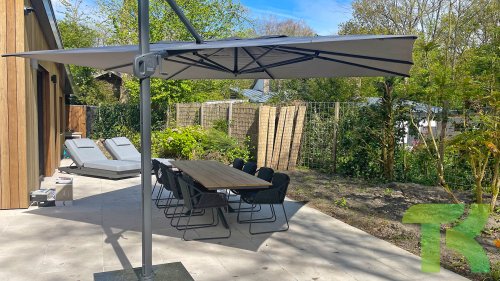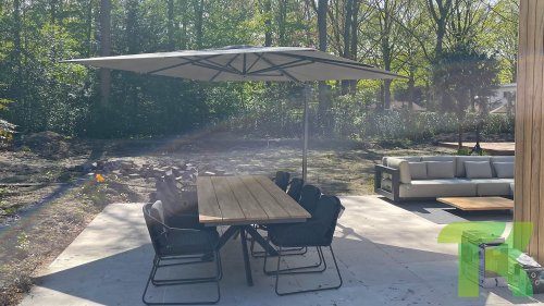 The 4Seasons hanging parasol has become a true classic. This cantilever parasol has proven its quality over time. The parasol can tilt backward to catch the low sun. It can also rotate on the base. See the video for more information. Standard 5-year warranty.