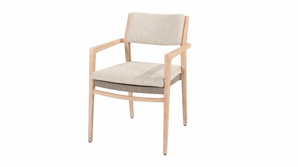 A stunning appearance A frame made of brushed teak is wrapped with taupe rope and finished with beige cushions, for a contemporary design that seamlessly integrates into your garden. Julia is an exceptional series, a 'natural beauty' with class. Enjoy timeless elegance and durability with the 4 Seasons Outdoor Julia stackable dining chair made of brushed teak. The teak is brushed, which means it has a rough, natural finish with light highlights in the grooves. This finish is unique and gives this outdoor furniture a distinctive look. This chair comes with cushions and has a beautiful, high-quality teak frame. The rope in a taupe color completes the whole. The back cushion is easily removable due to a subtle rope system. Also, from this series, a lounge and low dining set are available: 4SO Julia Lounge Set & 4SO Julia Low Dining Set.