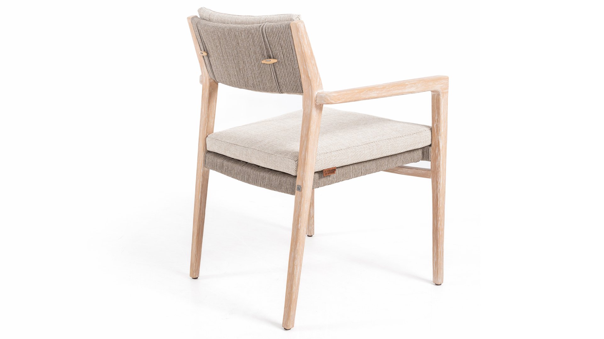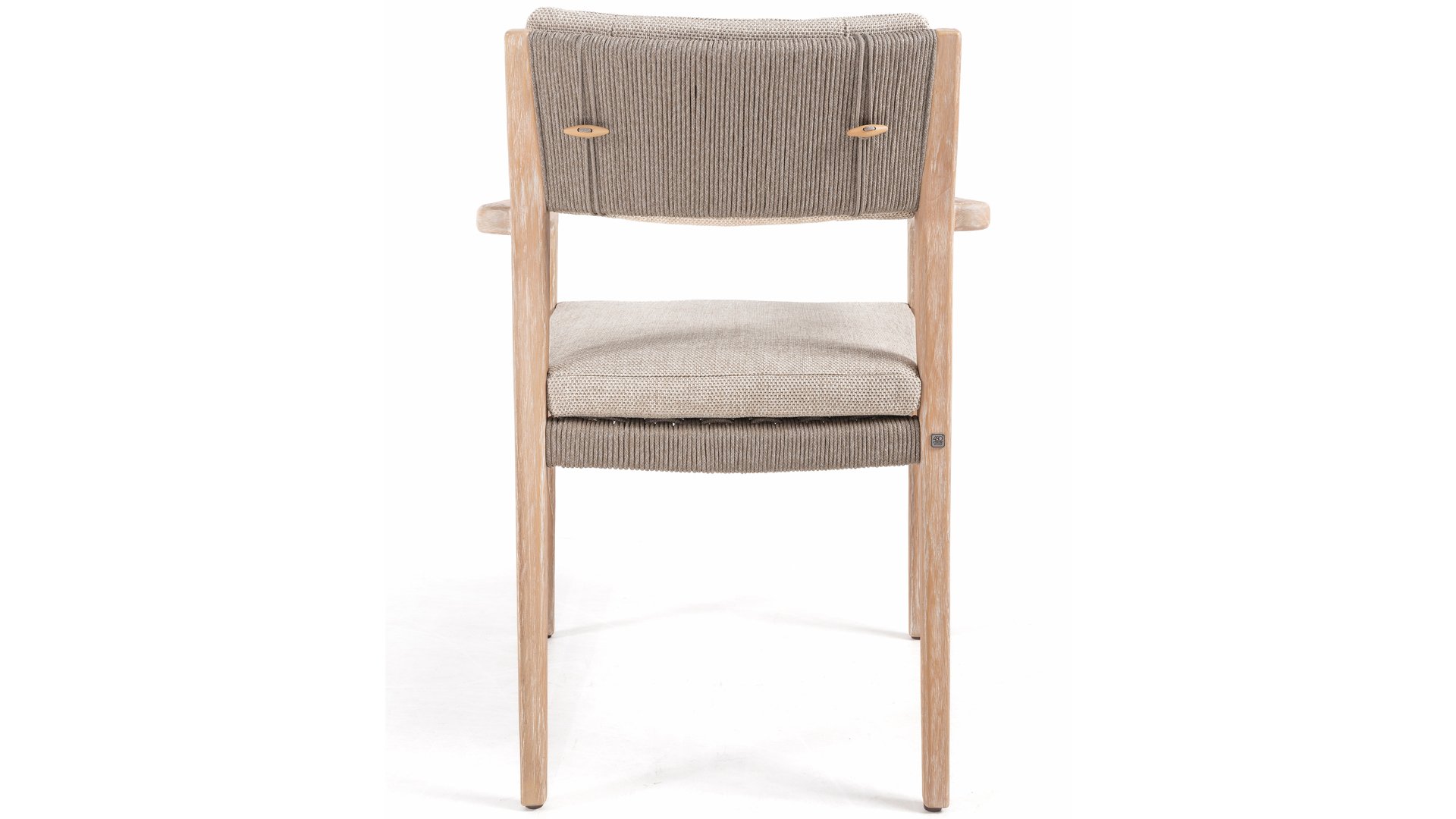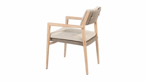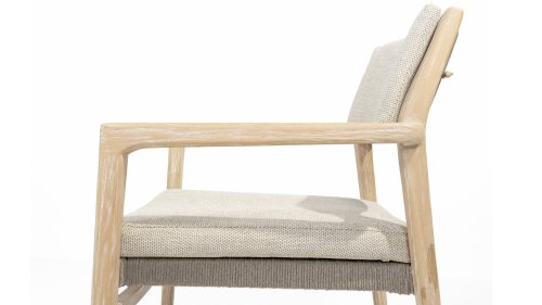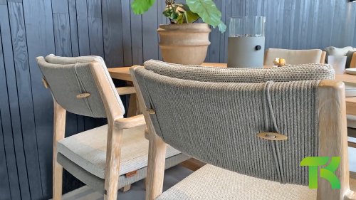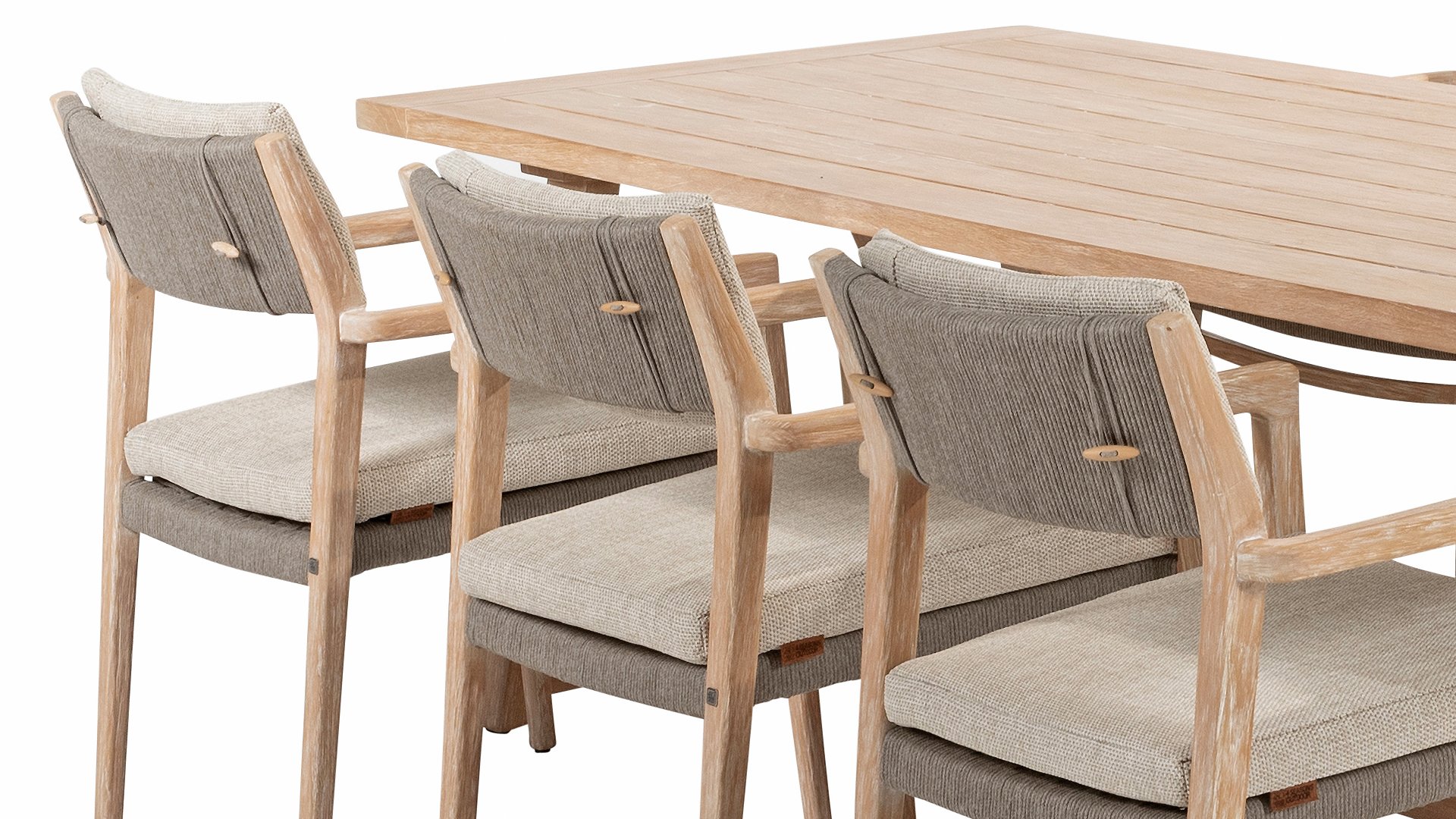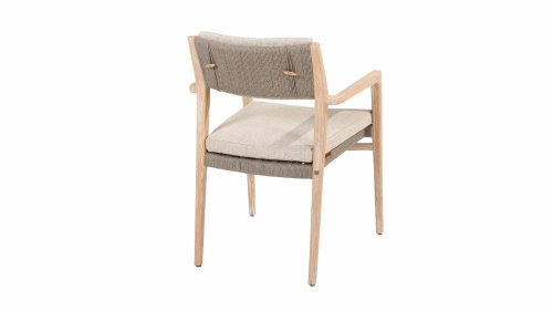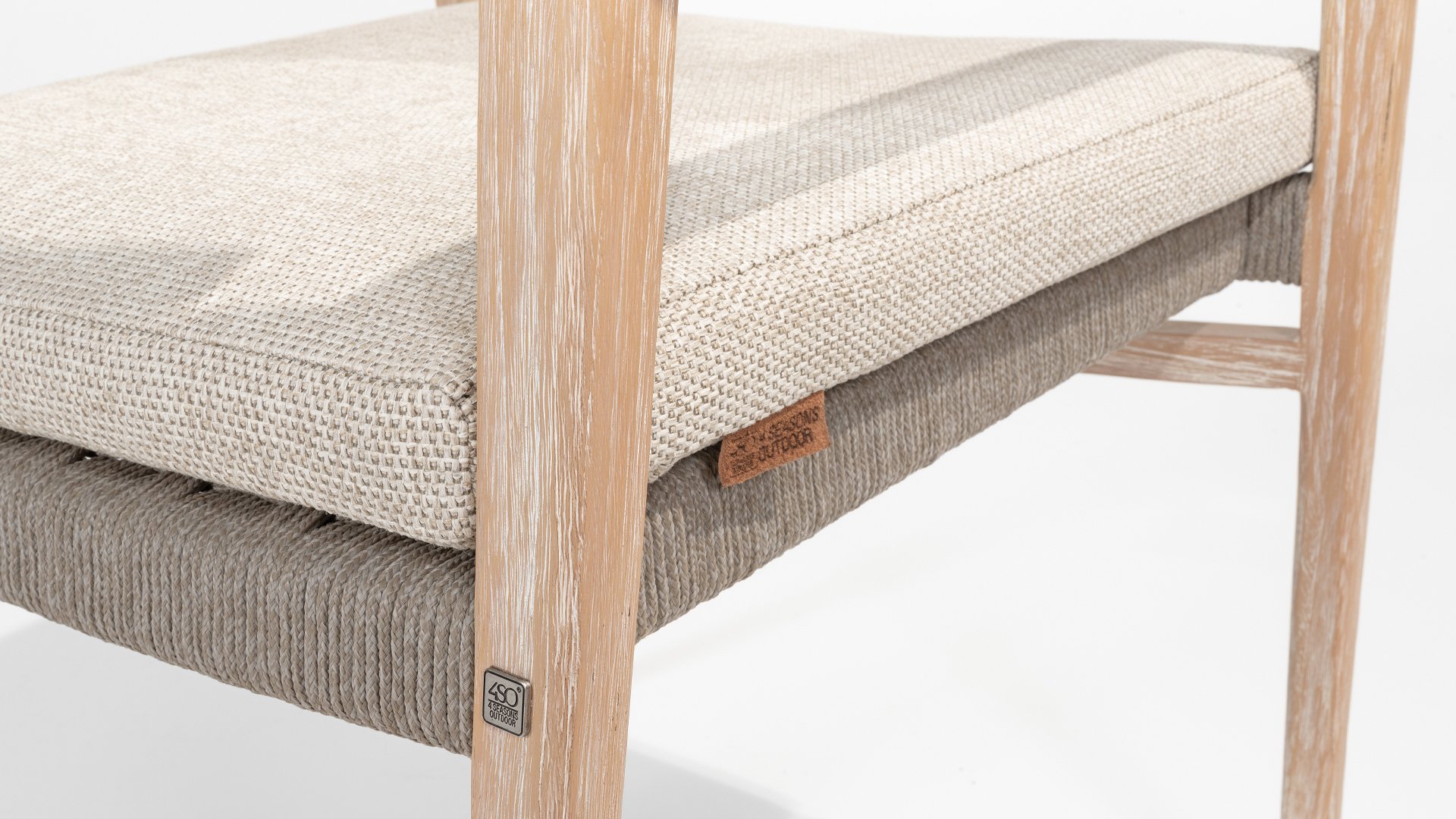 A stunning appearance A frame made of brushed teak wood is wrapped in taupe rope and finished with beige cushions, for a contemporary design that seamlessly blends into your garden. Julia is an exceptional series, a 'natural beauty' with class. Enjoy timeless elegance and durability with the 4 Seasons Outdoor Julia stackable dining chair made of brushed teak. The teak is brushed, which means it has a rough, natural finish with light highlights in the grooves. This finish is unique and gives this outdoor furniture a unique look. This chair is delivered including cushions and has a beautiful, high-quality teak wood frame. The rope in a taupe color completes the whole. The back cushion can be easily removed by means of a subtle rope system. This series also includes a lounge and low dining set: 4SO Julia Lounge Set & 4SO Julia Low Dining Set.