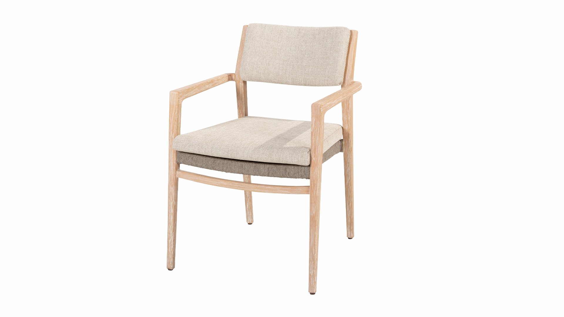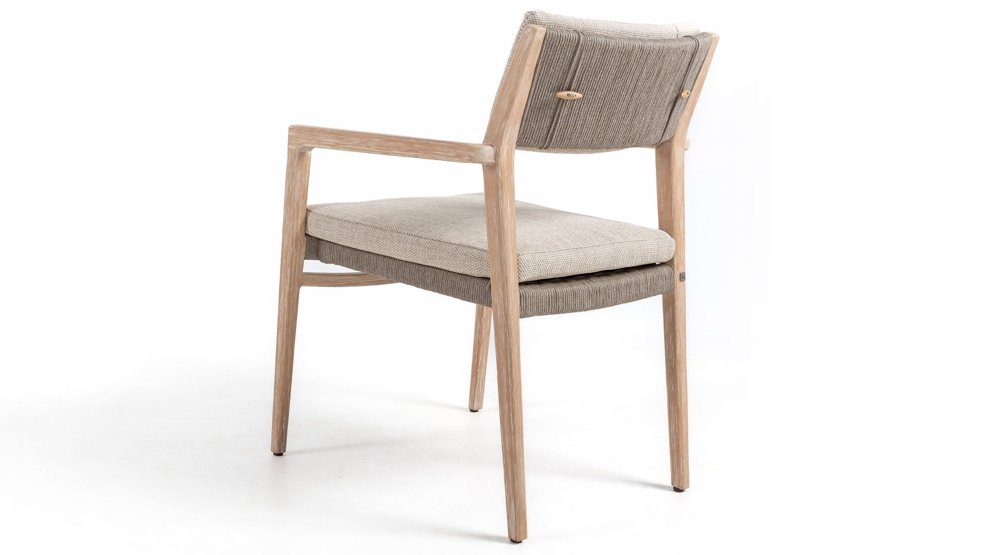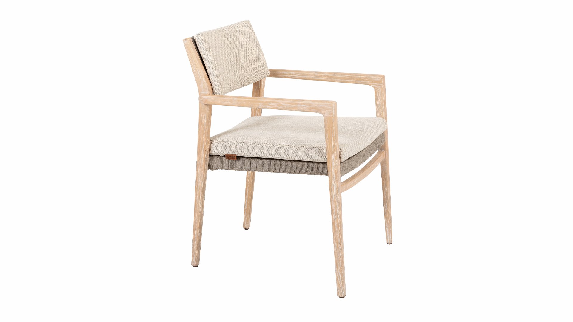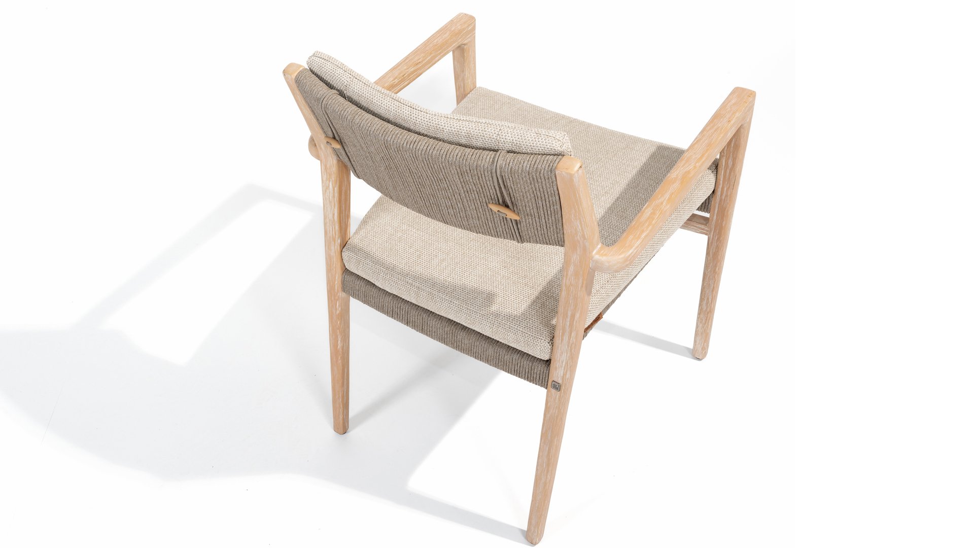A stunning appearance A frame made of brushed teak wood is wrapped in taupe rope and finished with beige cushions, for a contemporary design that seamlessly blends into your garden. Julia is an exceptional series, a 'natural beauty' with class. Enjoy timeless elegance and durability with the 4 Seasons Outdoor Julia stackable dining chair made of brushed teak. The teak is brushed, which means it has a rough, natural finish with light highlights in the grooves. This finish is unique and gives this outdoor furniture a unique look. This chair is delivered including cushions and has a beautiful, high-quality teak wood frame. The rope in a taupe color completes the whole. The back cushion can be easily removed by means of a subtle rope system. This series also includes a lounge and low dining set: 4SO Julia Lounge Set & 4SO Julia Low Dining Set.