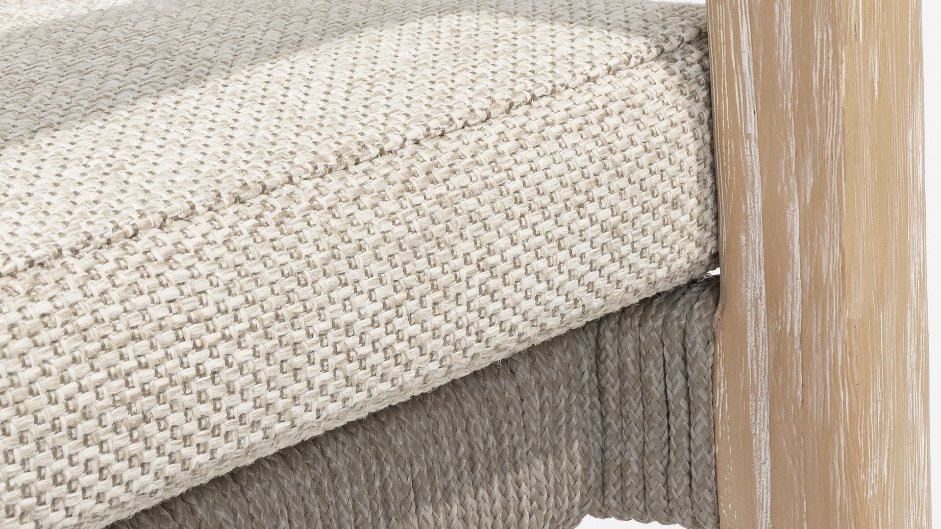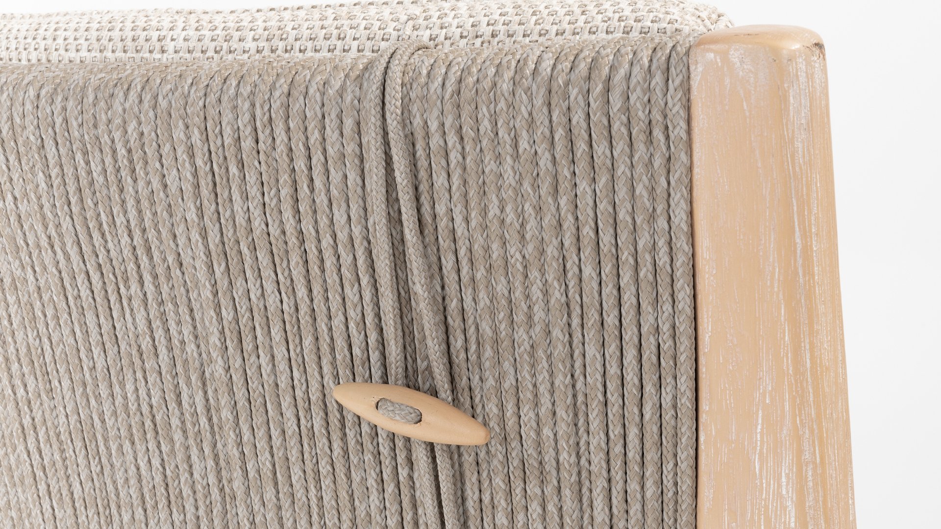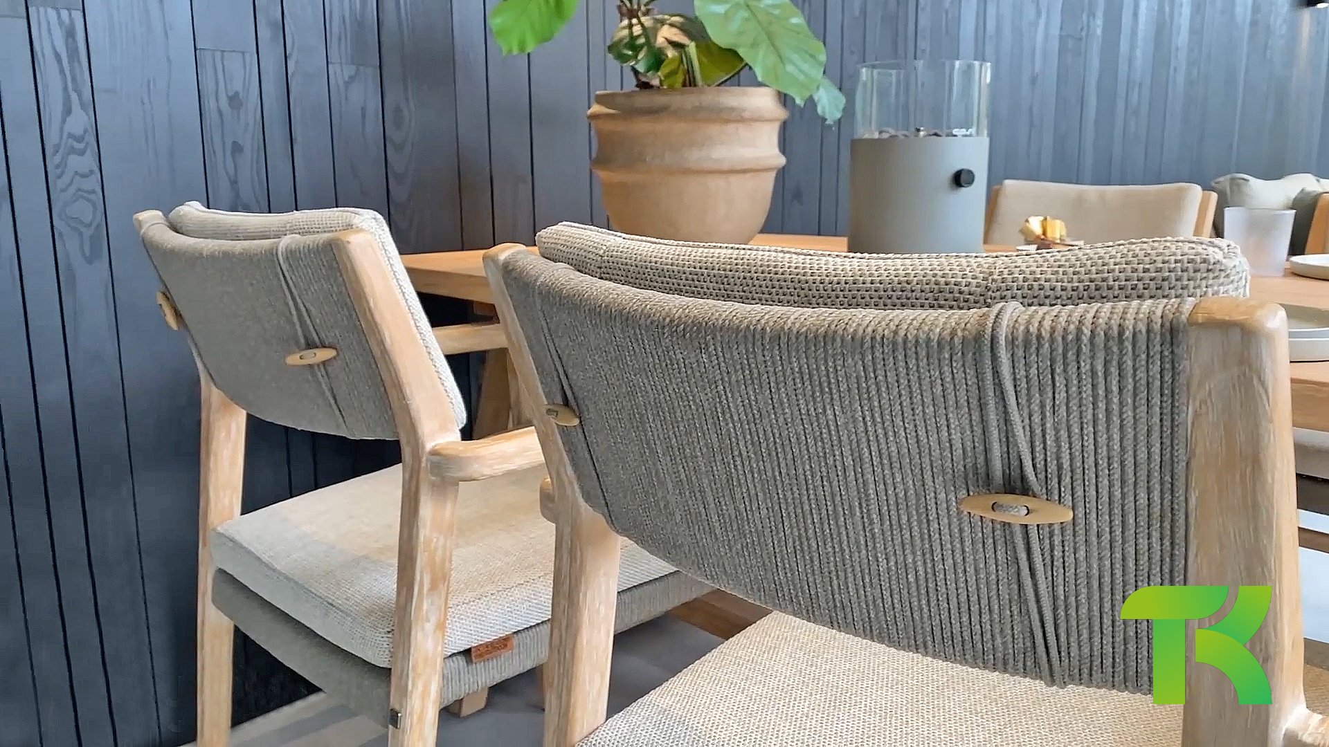 This beautiful material is perfect for outdoor use, because 4SO Rope is not just an shoelace. Our round wires have a synthetic core. This polypropylene base ensures minimal stretching of the rope and also does not absorb moisture. The covering is made of an acrylic fabric, similar to the weather-resistant fabric of our garden cushions. This covering feels soft but is highly water-repellent, UV-resistant, and colorfast. The flat rope variants have the same mix of weather-resistant materials, but the polypropylene material is interwoven with the acrylic fabric. This technique gives the flat rope the same properties but a completely different look. The stretch is minimal, and 4 Seasons Outdoor garden furniture with Rope is suitable for people weighing up to 110 kg. It's therefore an exceptionally strong material, but it's important to be careful with sharp objects. Our  Rope is weather-resistant, but a sharp object can seriously damage your garden furniture. We offer exclusive designs using hand-woven Rope patterns and techniques.