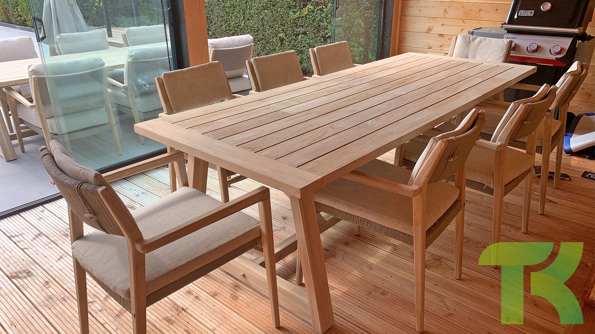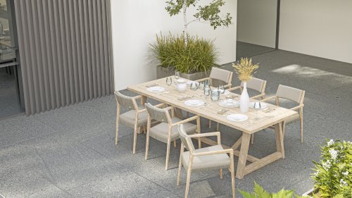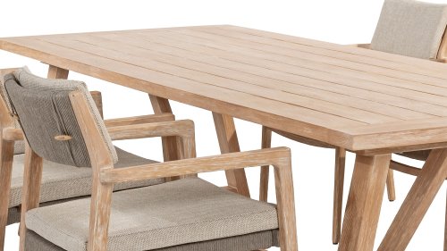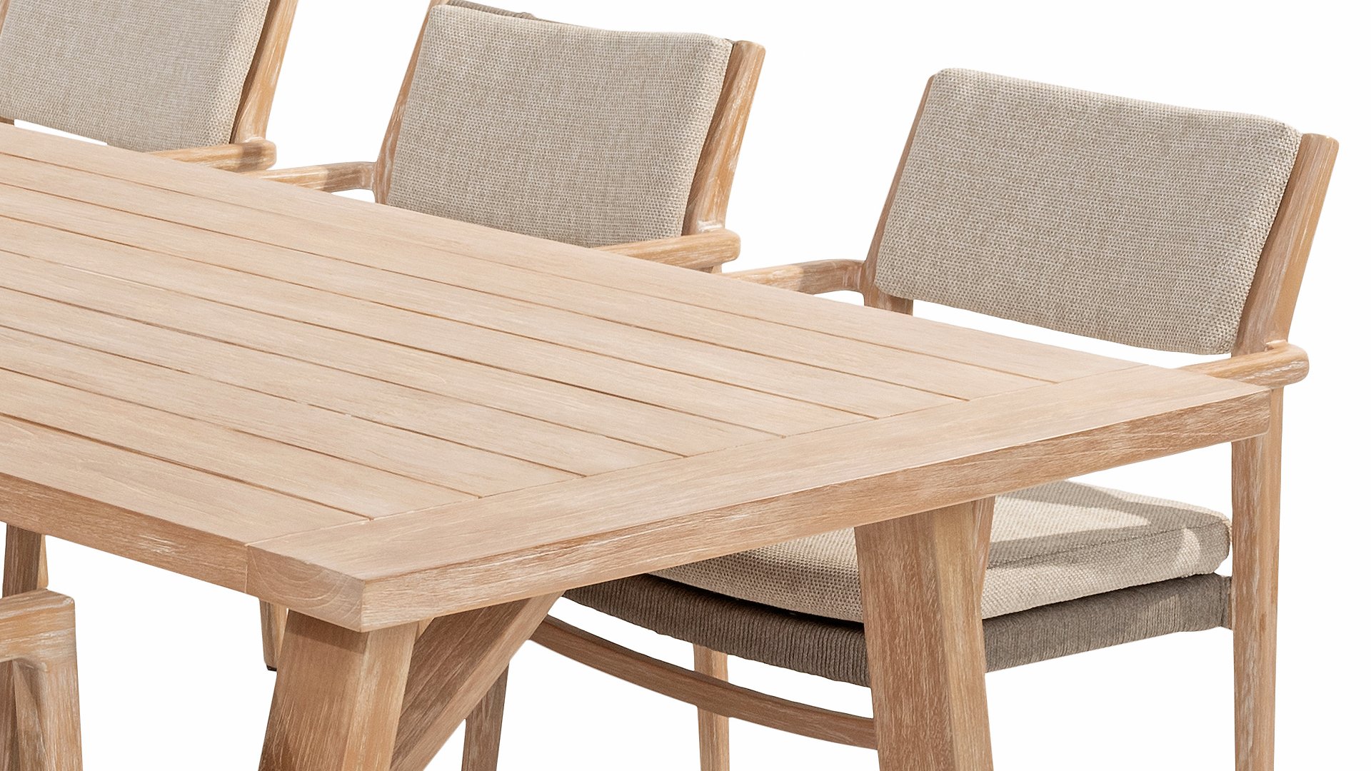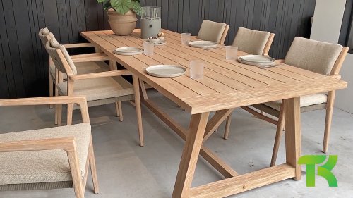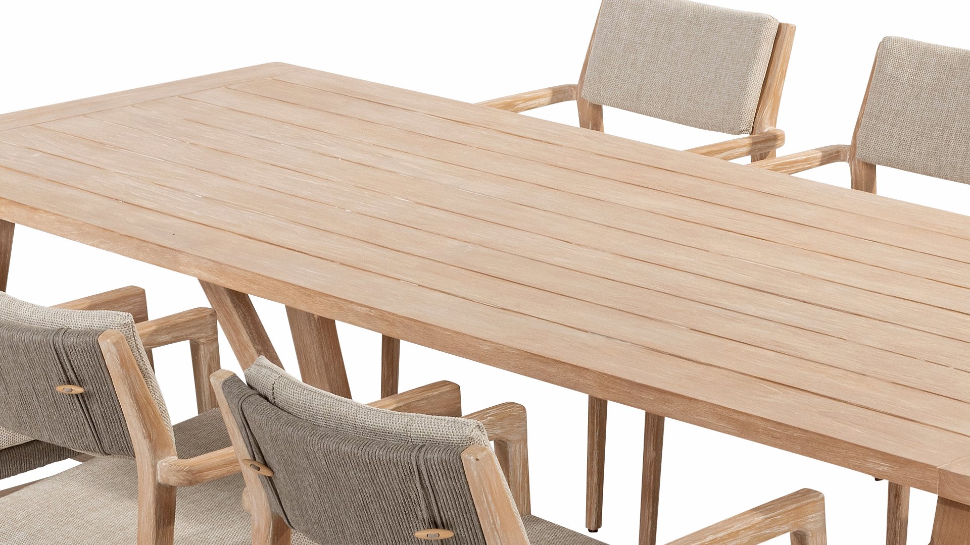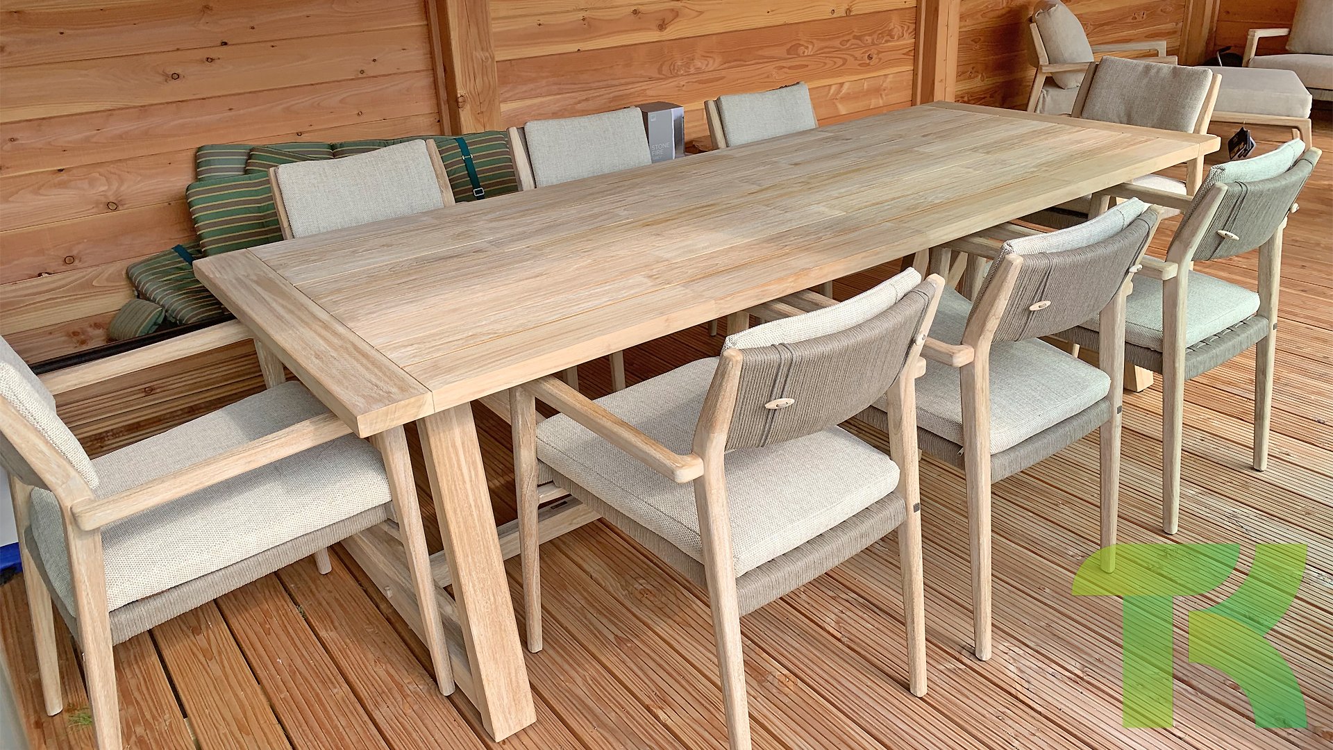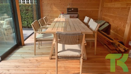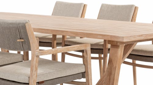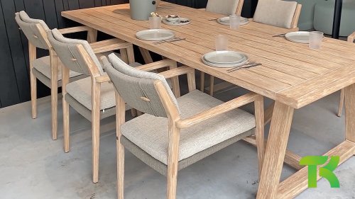 The Noah brushed teak table by Taste 4SO is a robust table that exudes elegance. The teak is brushed, which means it has a rough, natural finish with light highlights in the grooves. This finish gives the table a unique look. The size of 260 ensures ample seating space at this table. The Noah table is also available in the standard teak finish, and with a stainless steel base.