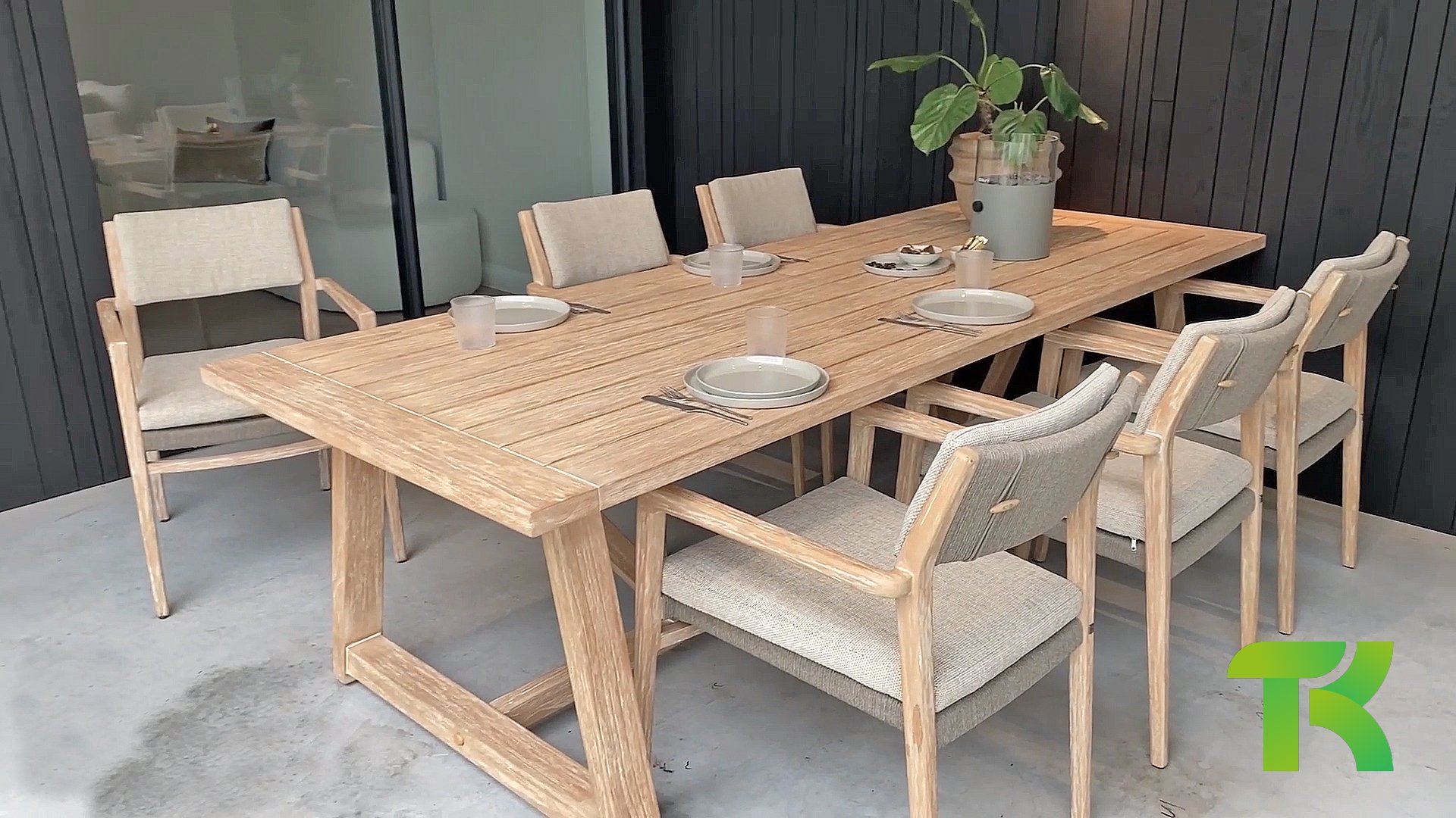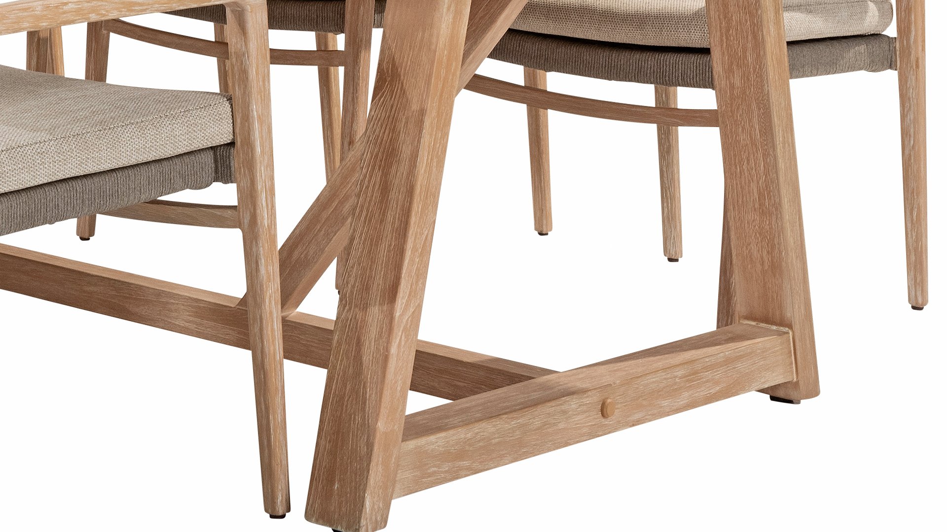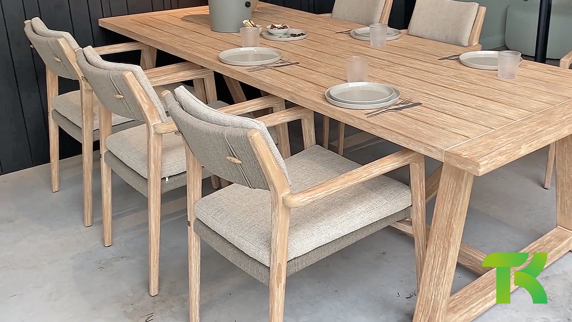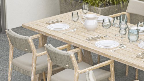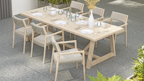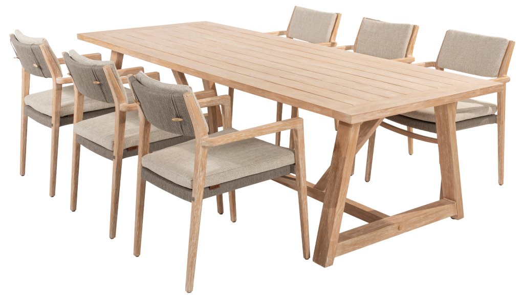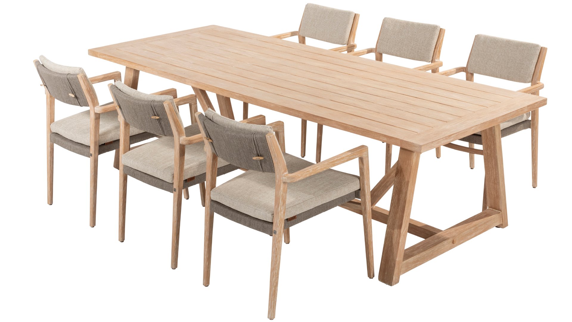 The Noah brushed teak table by Taste 4SO is a robust table that exudes elegance. The teak is brushed, which means it has a rough, natural finish with light highlights in the grooves. This finish gives the table a unique look. The size of 260 ensures ample seating space at this table. The Noah table is also available in the standard teak finish, and with a stainless steel base.