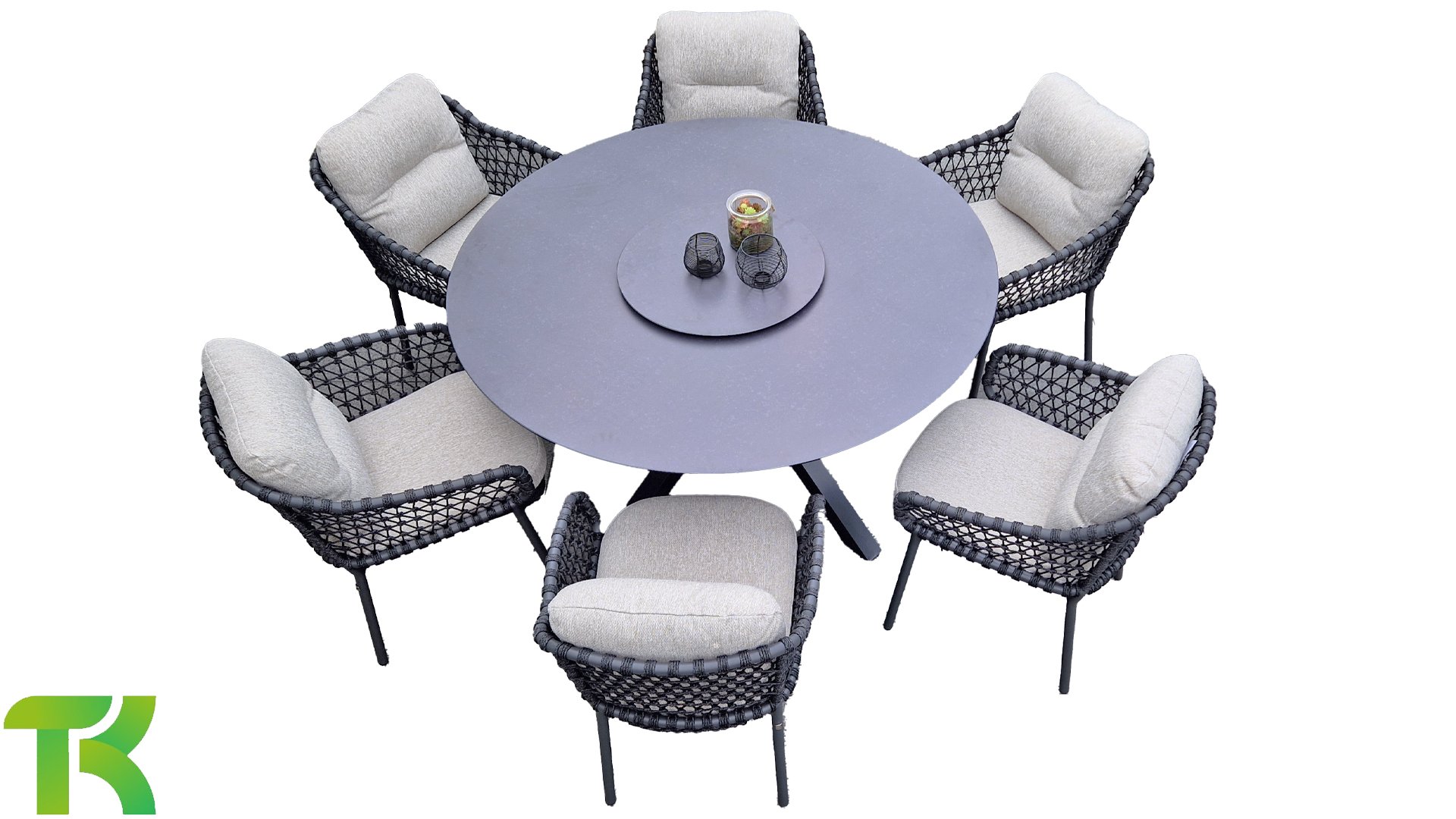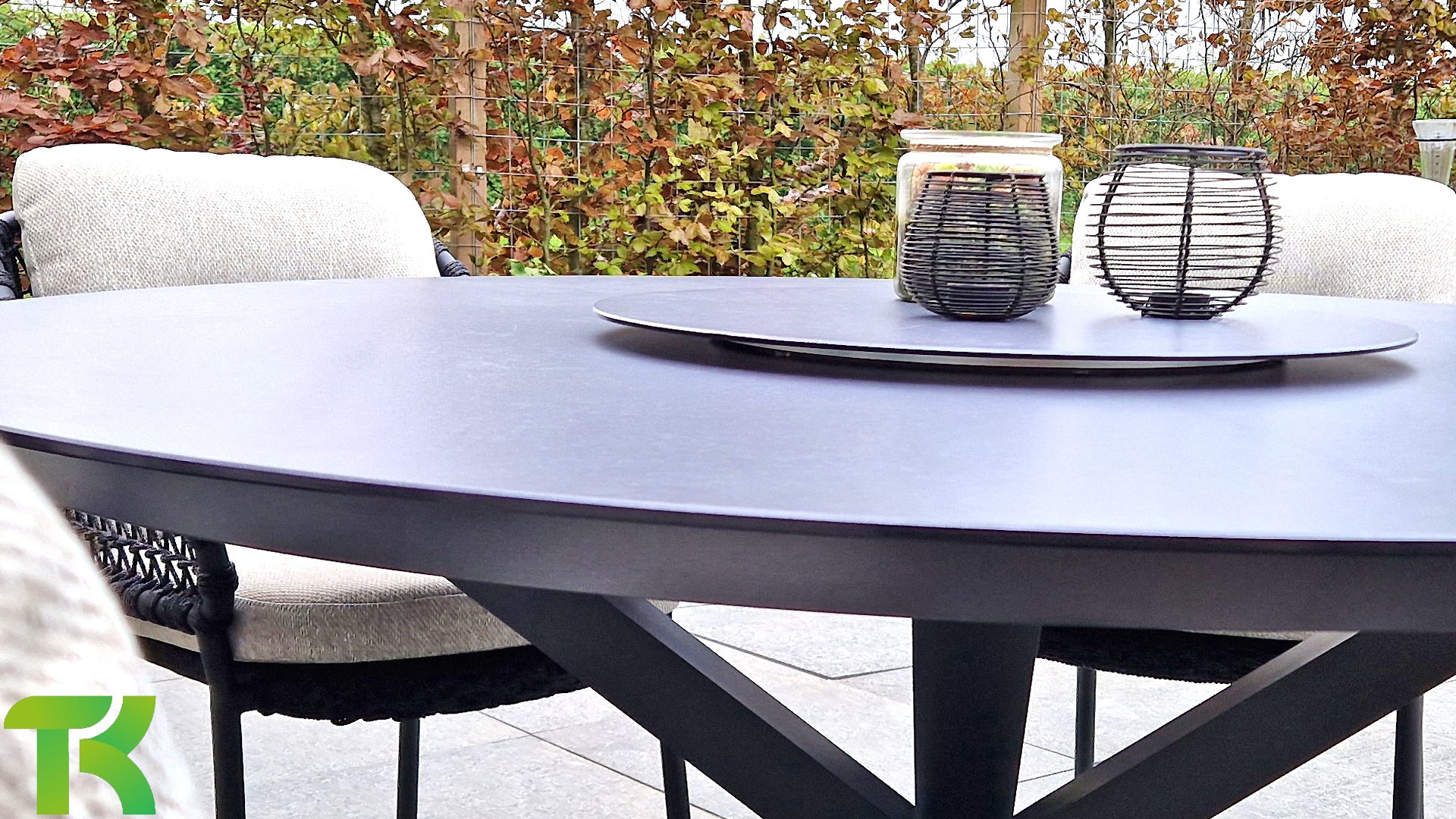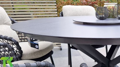 Made of powder-coated aluminum in an Anthracite color and a 5mm ceramic on glass tabletop. The table is virtually maintenance-free. The table also comes with a Lazy Susan turntable, which is ideal for when you have visitors and want to pass something around. This beautiful table combines functionality with a stylish design, making it the ideal choice for anyone who loves outdoor living.