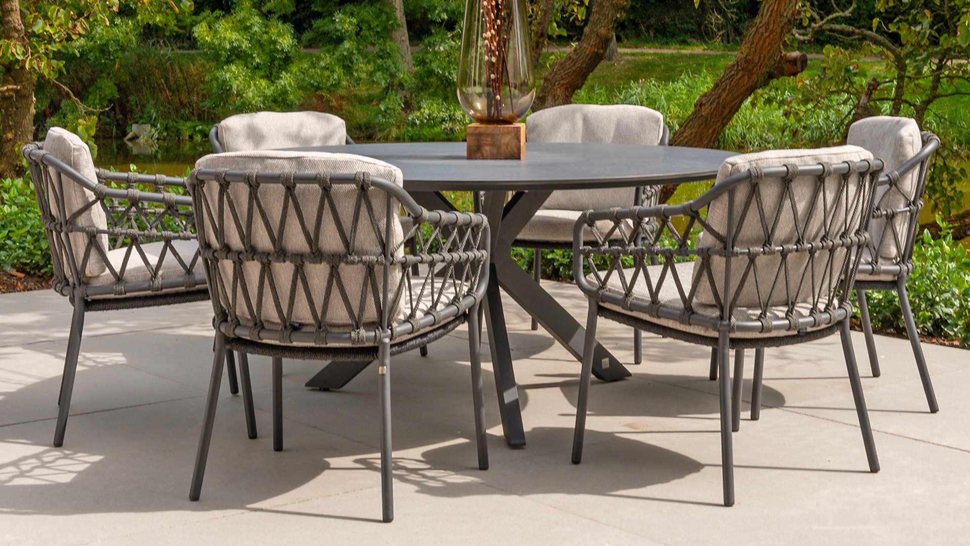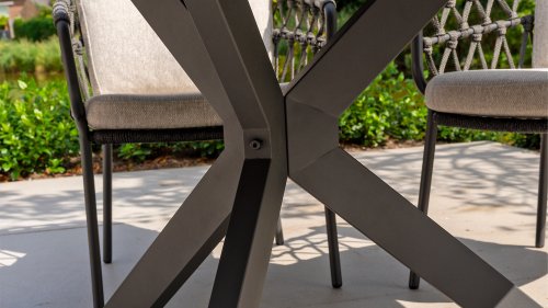 The Locarno table by 4 Seasons outdoor is very low maintenance. The HPL top in slate anthracite gives your terrace a modern and sleek appearance. In the dark anthracite, light veins run through, making the top look natural. The cross base gives the table a modern and elegant look. To make it even more fun and practical, there is also a rotating plate available. The table is also available in Ø130cm size: 4 Seasons Outdoor Locarno Table Ø130cm Anthracite.