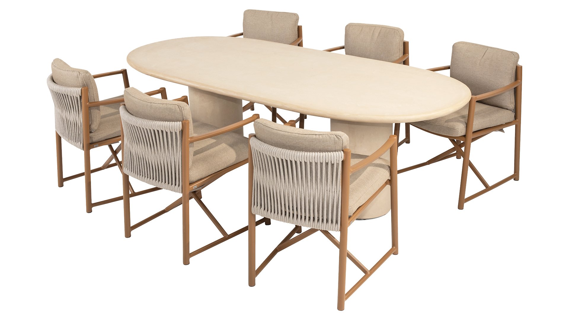 Meet Hampton: the perfect balance between refined elegance and robust simplicity. This beautiful garden table in a stylish beige/white hue exudes tranquility and luxury, and forms the heart of any outdoor space – from intimate dinners to long summer evenings with friends and family. The Hampton is crafted from high-quality Mortex, a durable and waterproof material known for its natural look and exceptional weather resistance. Each tabletop is hand-finished, creating a unique, warm look that effortlessly complements both modern and Mediterranean gardens. The table is available in various sizes, so there's always a Hampton to suit your outdoor living space. Choose the round Ø160cm version for a cozy setting with a single, elegant central leg, or opt for the generous oval 240cm or 300cm versions, both featuring two sleek, vertical legs that provide stability and a bold, linear design. For those who prefer a more relaxed dining experience, there's also a low-dining version Ø160cm, ideal for relaxing moments in lounge style.