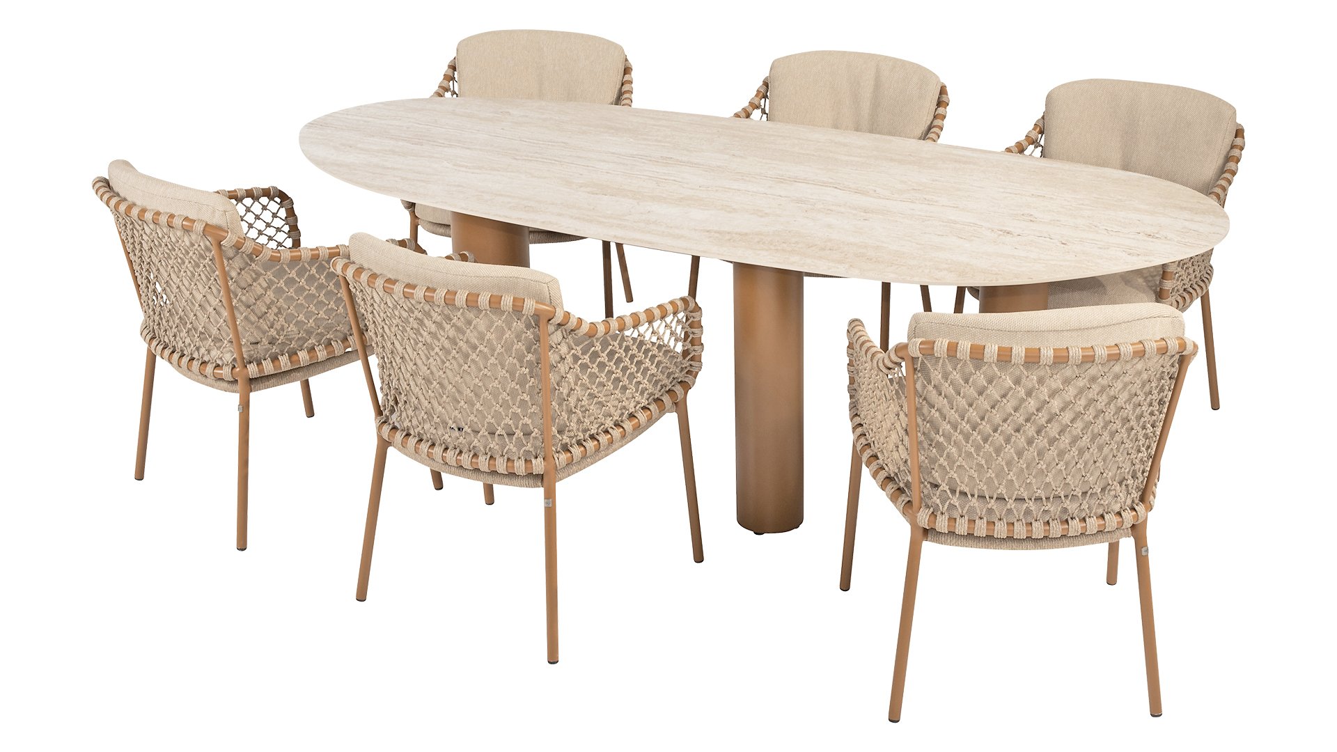 With an elegant and airy braided rope structure in a warm amber color, combined with a subtly curved backrest. The combination of the open rope weave and the natural tones creates a modern, inviting atmosphere. The soft sand-colored cushions provide comfortable seating, ideal for long summer evenings at the table. The sleek frame is made of powder-coated aluminum in a warm amber hue. Thanks to the use of durable, weather-resistant materials, the Martinique Dining chair is not only a feast for the eyes but also resistant to the elements. The 4Seasons Martinique also has a lounge variant.