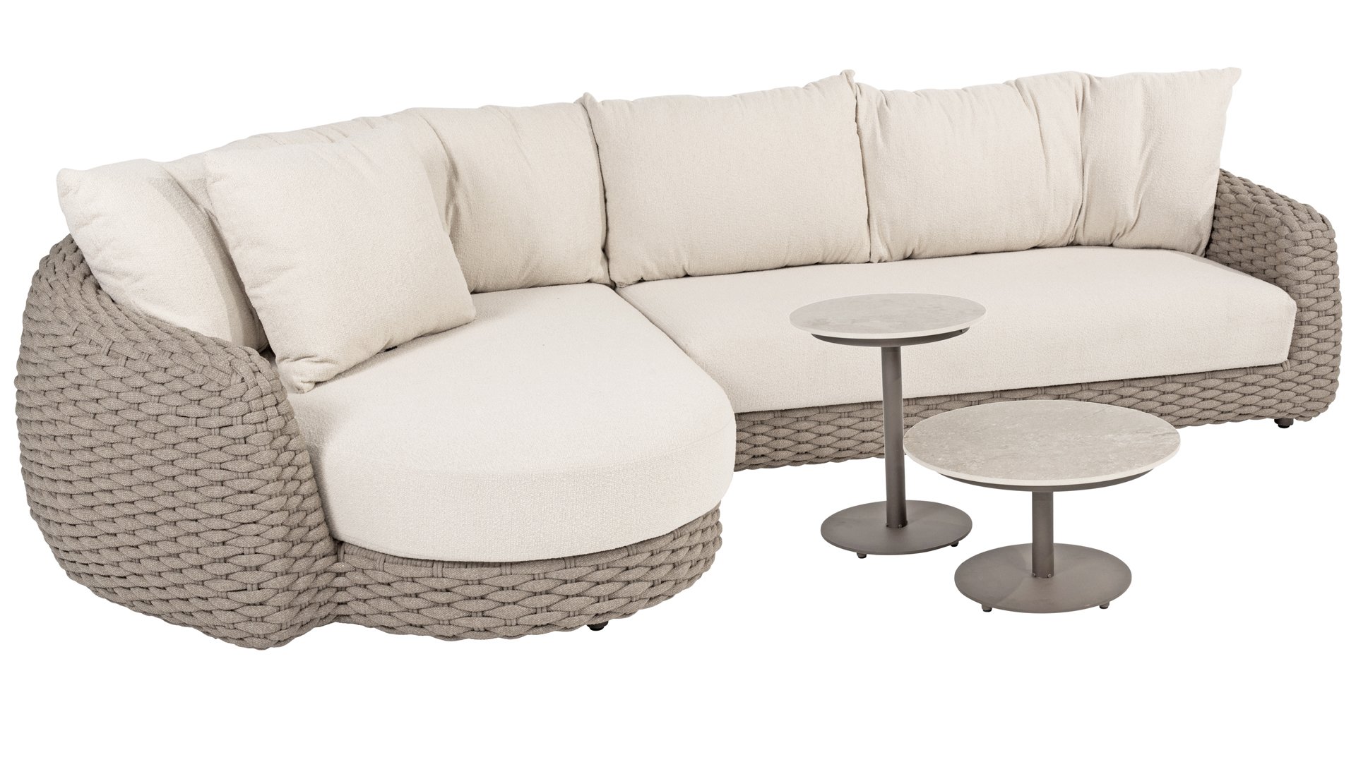 Enhance your lounge experience with the Maxime lounge from 4 Seasons Outdoor. This 4SO Maxime lounge set is a perfect addition to your luxury terrace. The stunning curves are a feast for the eyes, while the thick lounge cushions in cream boucle fabric ensure total relaxation.