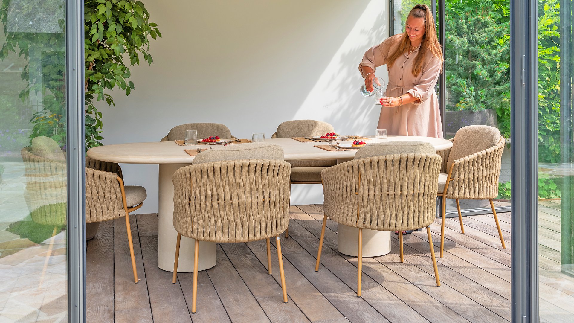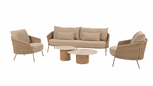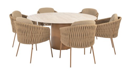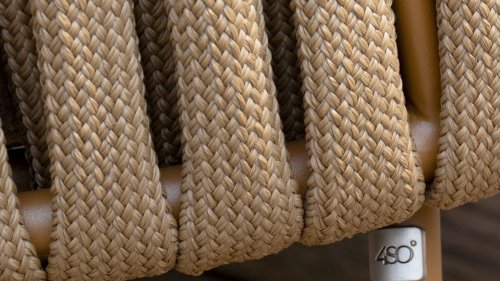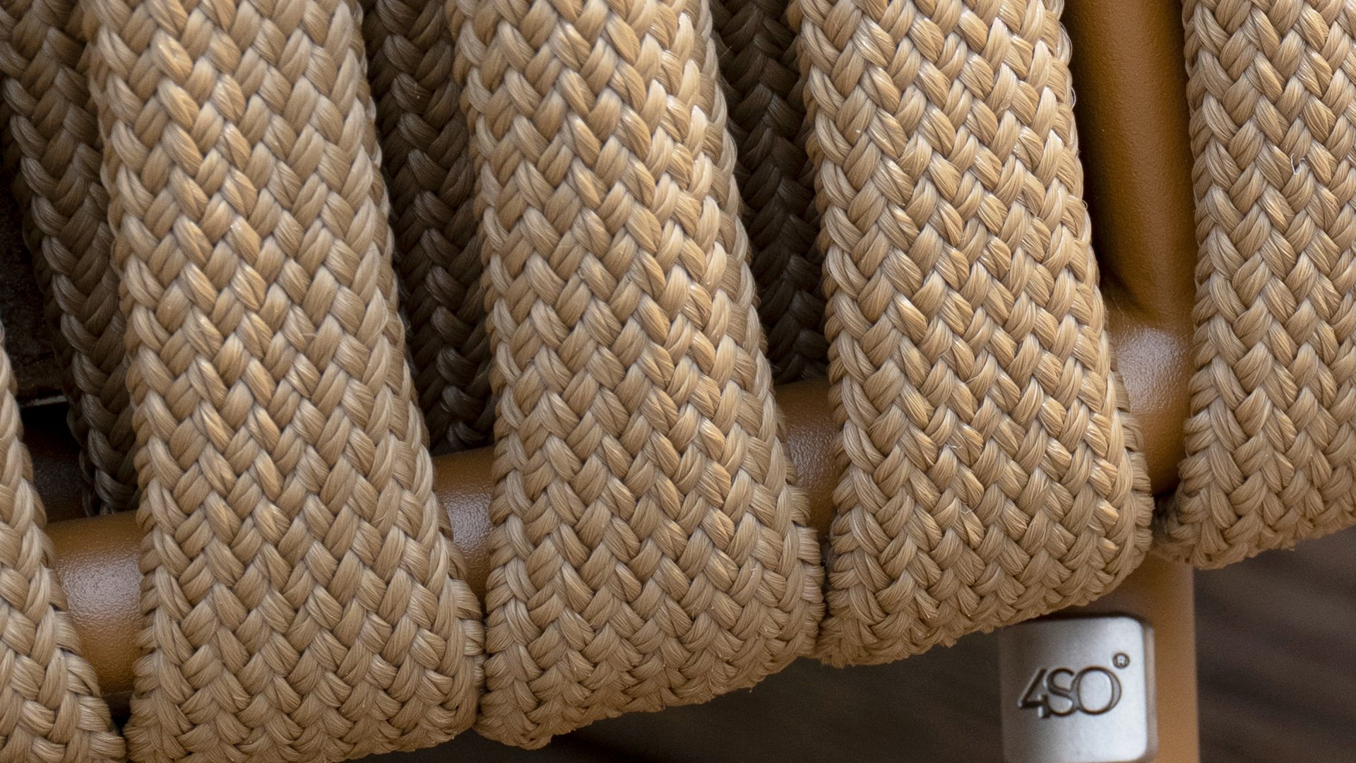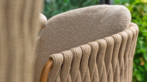 The frame is crafted from powder-coated stainless steel in a warm, earthy amber tone, combined with striking, thick rope wickerwork. This artisanal finish gives the Amber series a robust yet refined appearance. The weather-resistant Olefin cushion covers are UV- and mildew-resistant – ideal for years of outdoor use. The chair's shell provides comfortable back and arm support.
