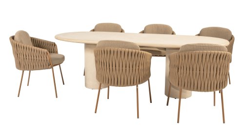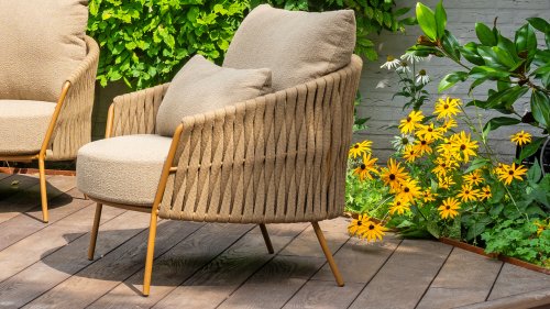 The 4 Seasons Outdoor Molina Amber Dining Set is a perfect choice for any outdoor space. With its thickly braided brown rope and generously filled cushions in a soft, amber bouclé fabric, this set invites ultimate relaxation in your garden or on your patio.