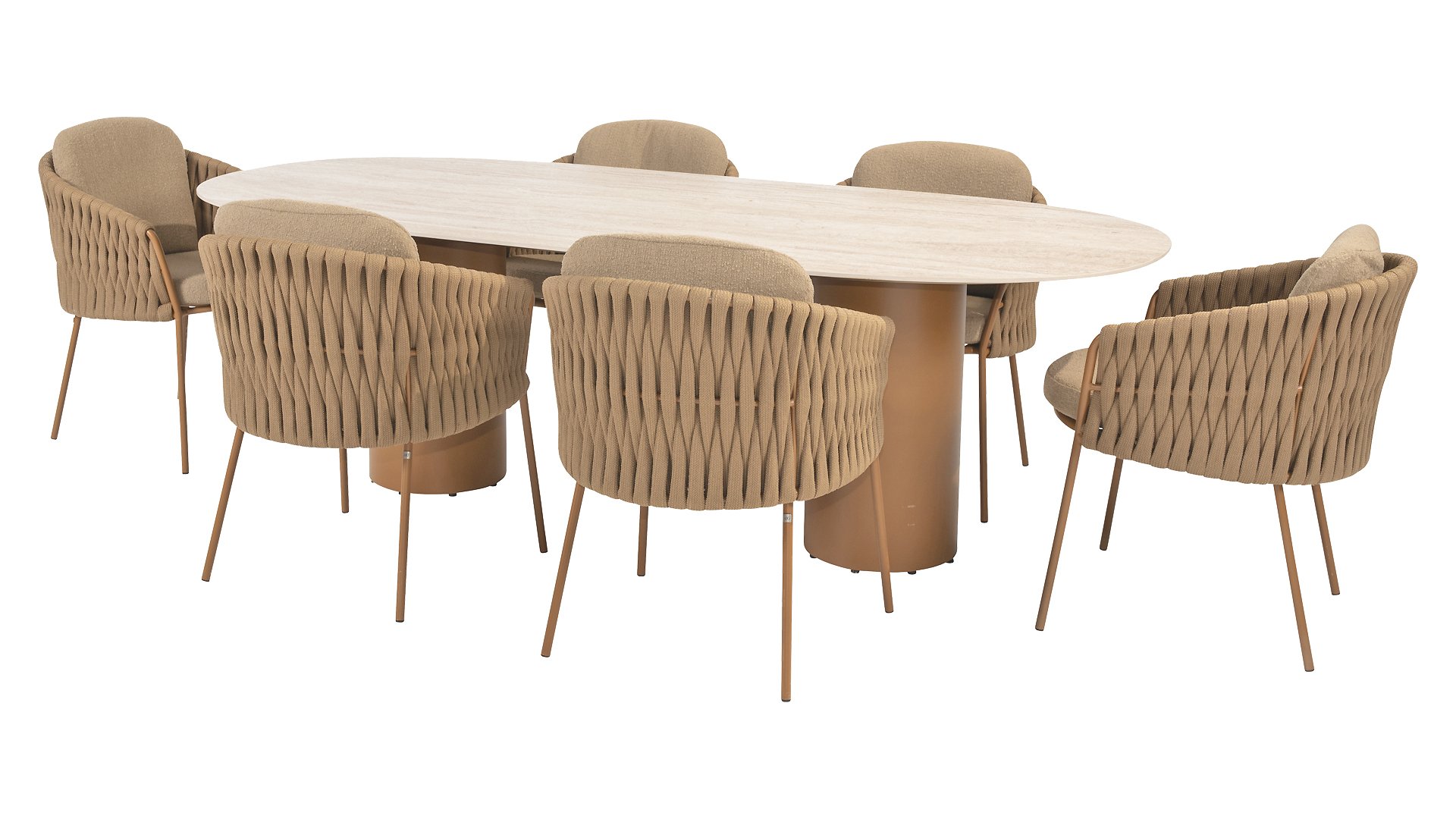 The frame is crafted from powder-coated stainless steel in a warm, earthy amber tone, combined with strikingly thick rope wickerwork. This artisanal finish gives the Amber series a robust yet refined appearance. The weather-resistant Olefin cushion covers are UV- and mildew-resistant – ideal for years of outdoor use. The chair's shell provides comfortable back and arm support.