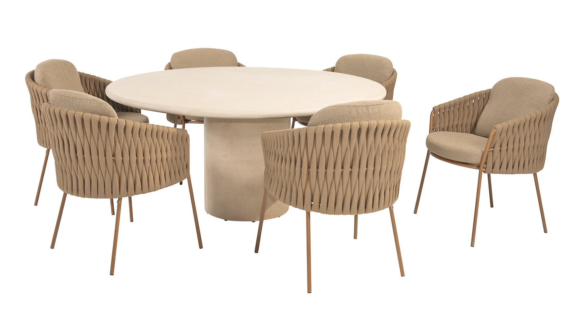The frame is crafted from powder-coated stainless steel in a warm, earthy amber tone, combined with strikingly thick rope wickerwork. This artisanal finish gives the Amber series a robust yet refined appearance. The weather-resistant Olefin cushion covers are UV- and mildew-resistant – ideal for years of outdoor use. The chair's shell provides comfortable back and arm support.