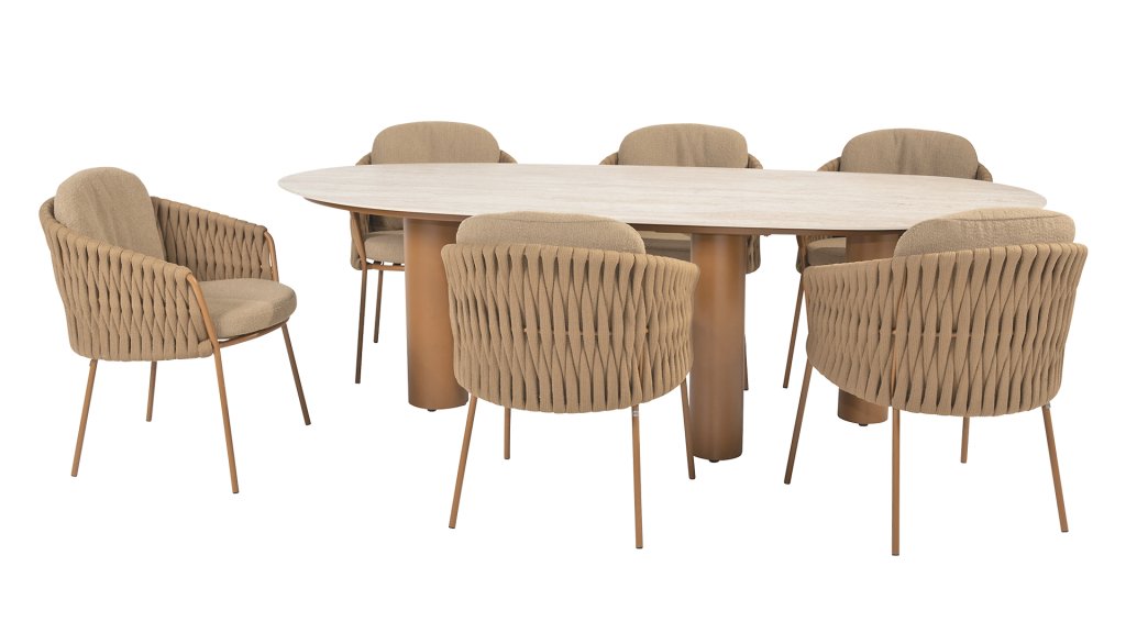 The 4 Seasons Outdoor Molina Amber Dining set is a perfect choice for any outdoor space. With its thickly braided brown rope and richly filled cushions in a soft, amber bouclé fabric, this set invites ultimate relaxation in your garden or on your patio.