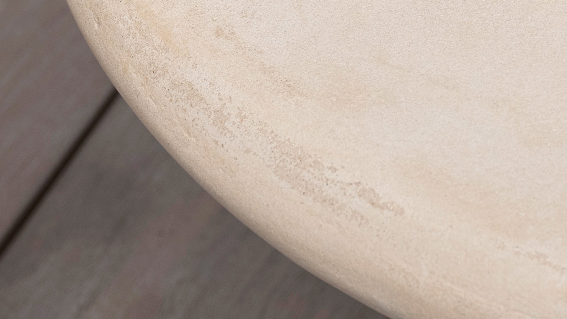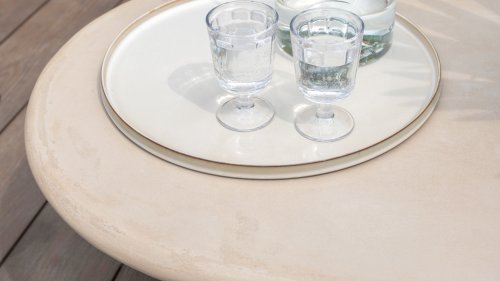 Mortex is made from a mixture of lime, cement, and fine mineral powders. Pigments and resins are added to this mixture to make it flexible, waterproof, and adhere well. It is applied by hand in thin layers and then sanded and finished with a protective sealer or wax. This creates a seamless, strong, and stylish surface suitable for furniture, floors, and walls, among other things. A Mortex garden table is weatherproof. Rain, sunlight, and temperature fluctuations have little effect on the material, provided the table is properly finished with a protective layer. It is important to be careful with acidic substances such as lemon juice, vinegar, or wine. If these remain on the surface for too long, they can damage the protective layer and cause stains.