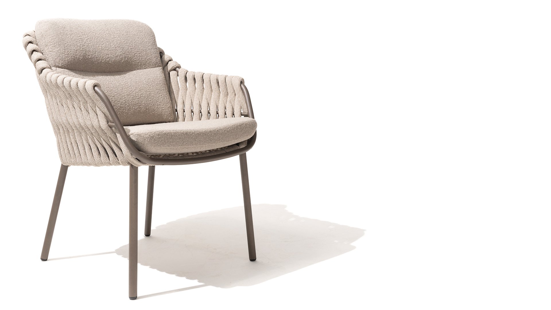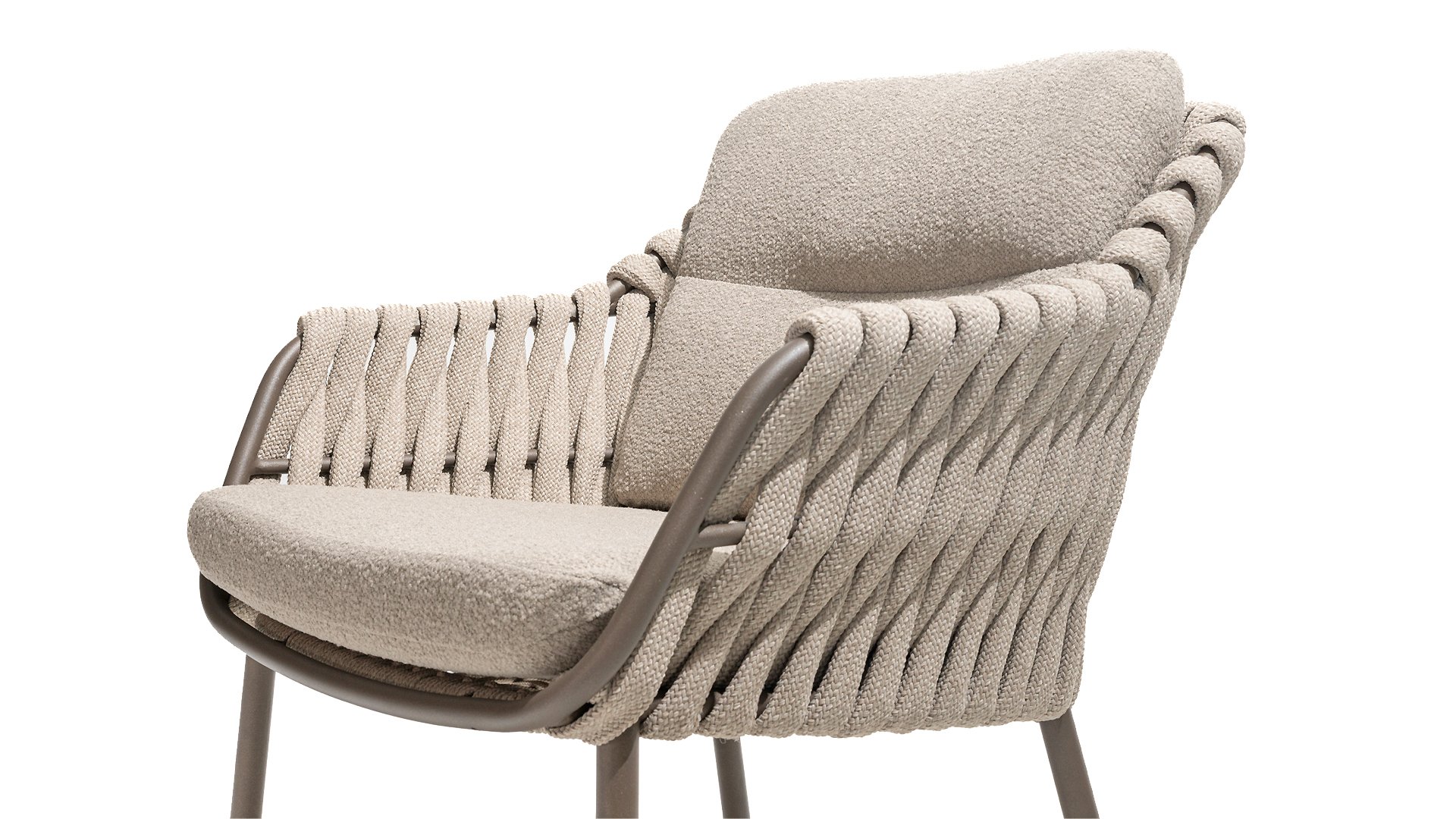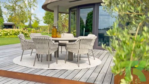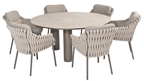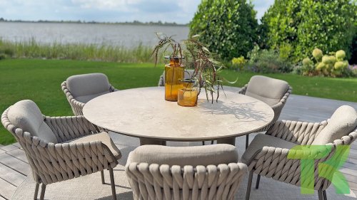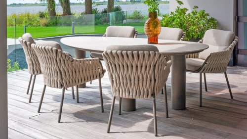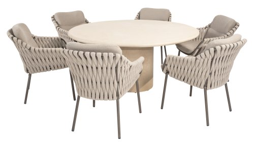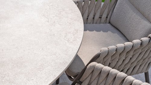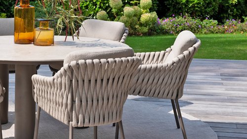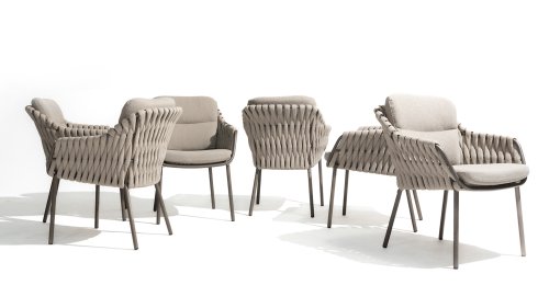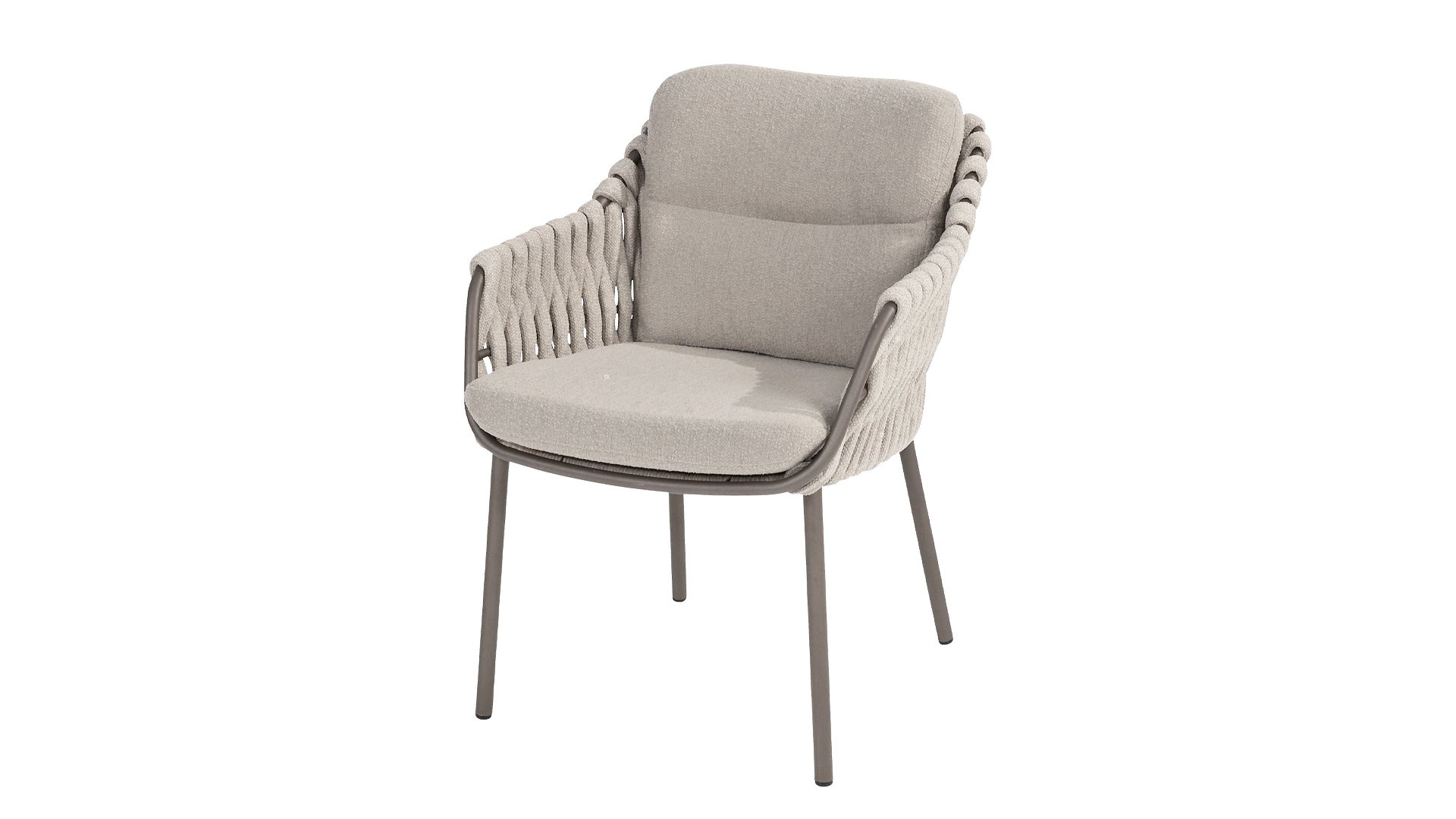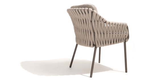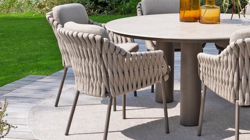 The 4 Seasons Outdoor Montera in the Terre color. It has a delightful seating comfort, soft colors, and a friendly design with a beautiful pattern of thick Rope thread. Unlike normal, the cushions in this series are Bouclé for a slightly more elegant look. Discover the perfect combination of comfort and design with the 4 Seasons Outdoor Montera dining chair.