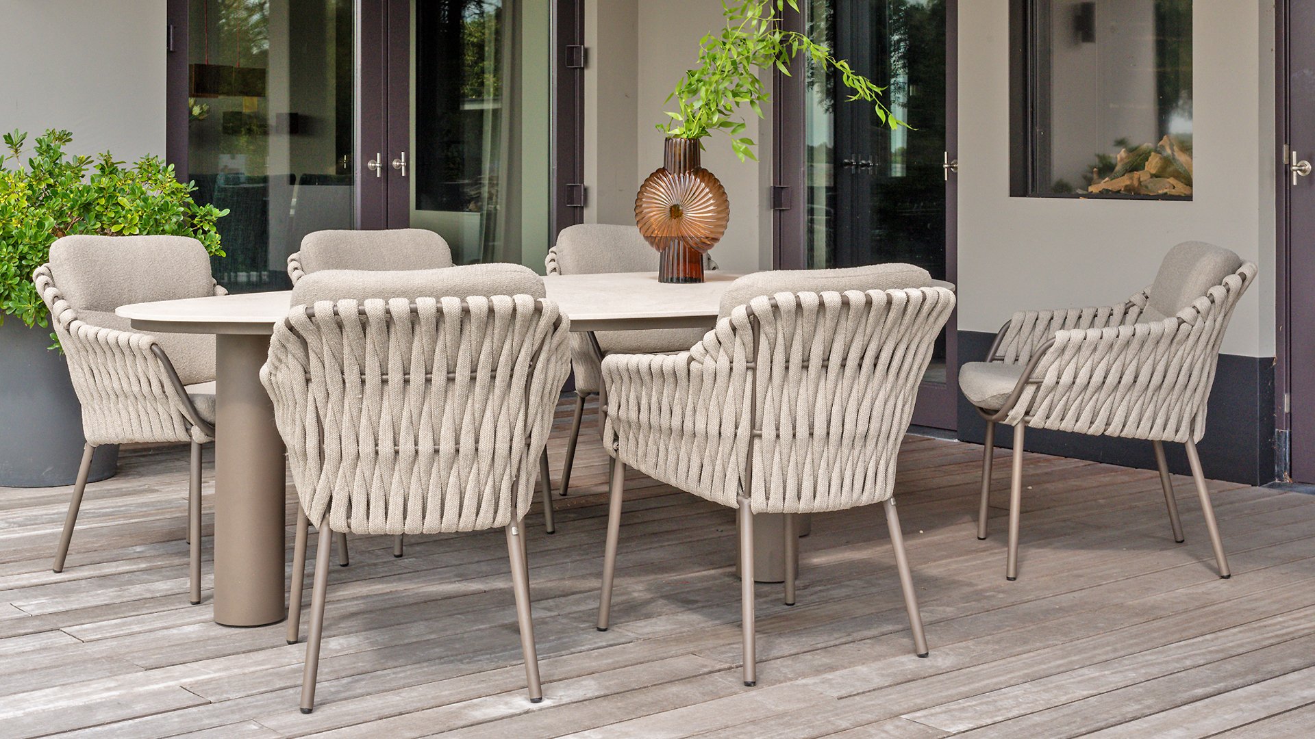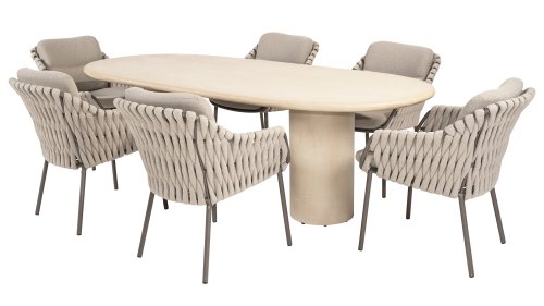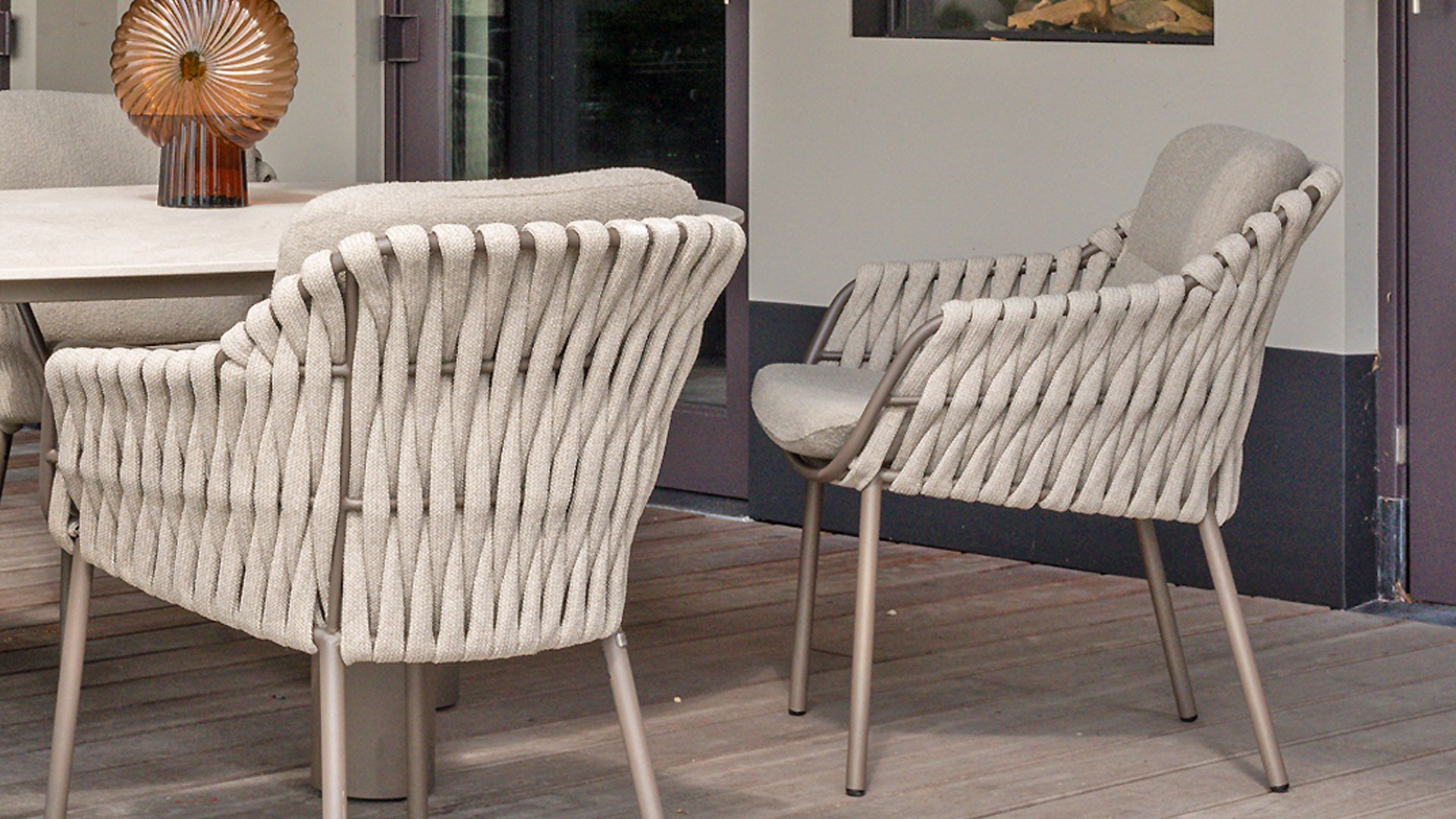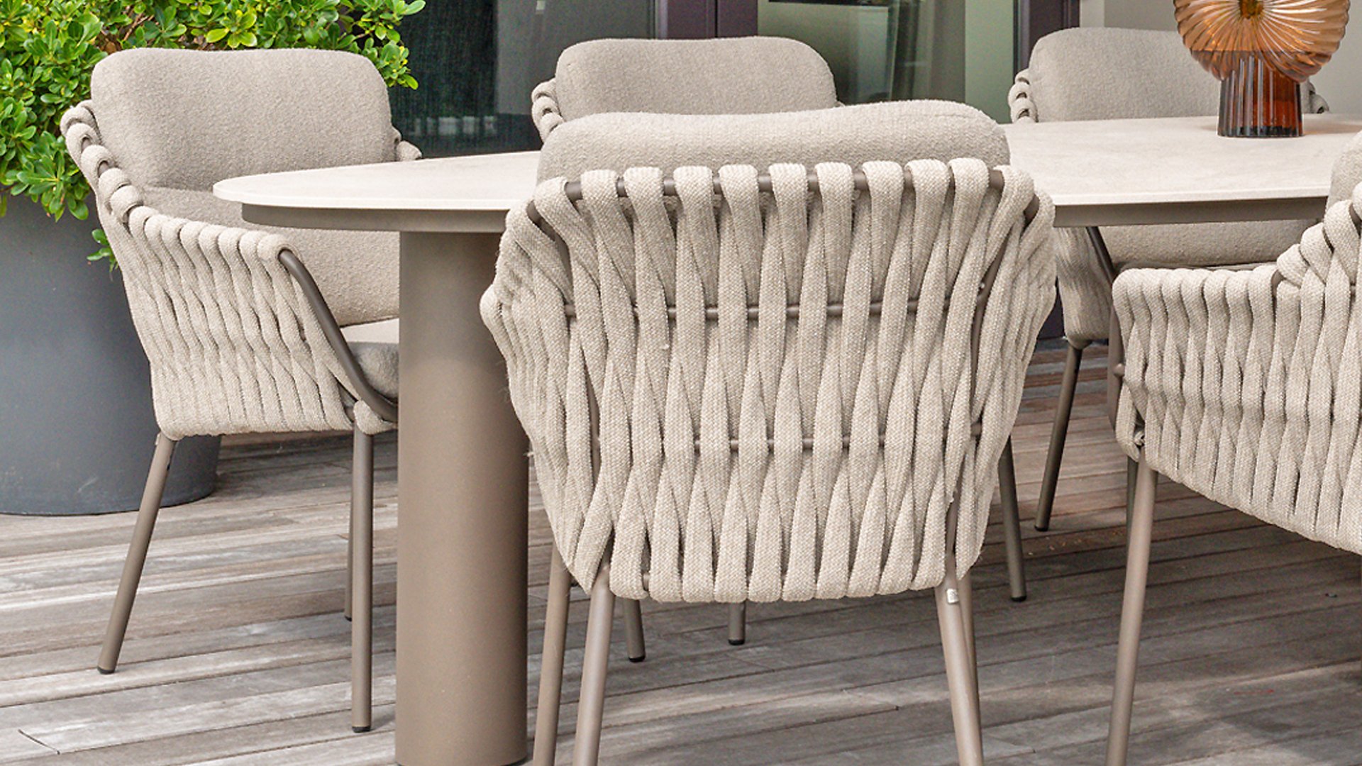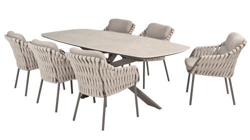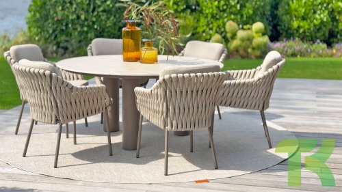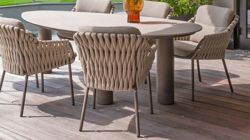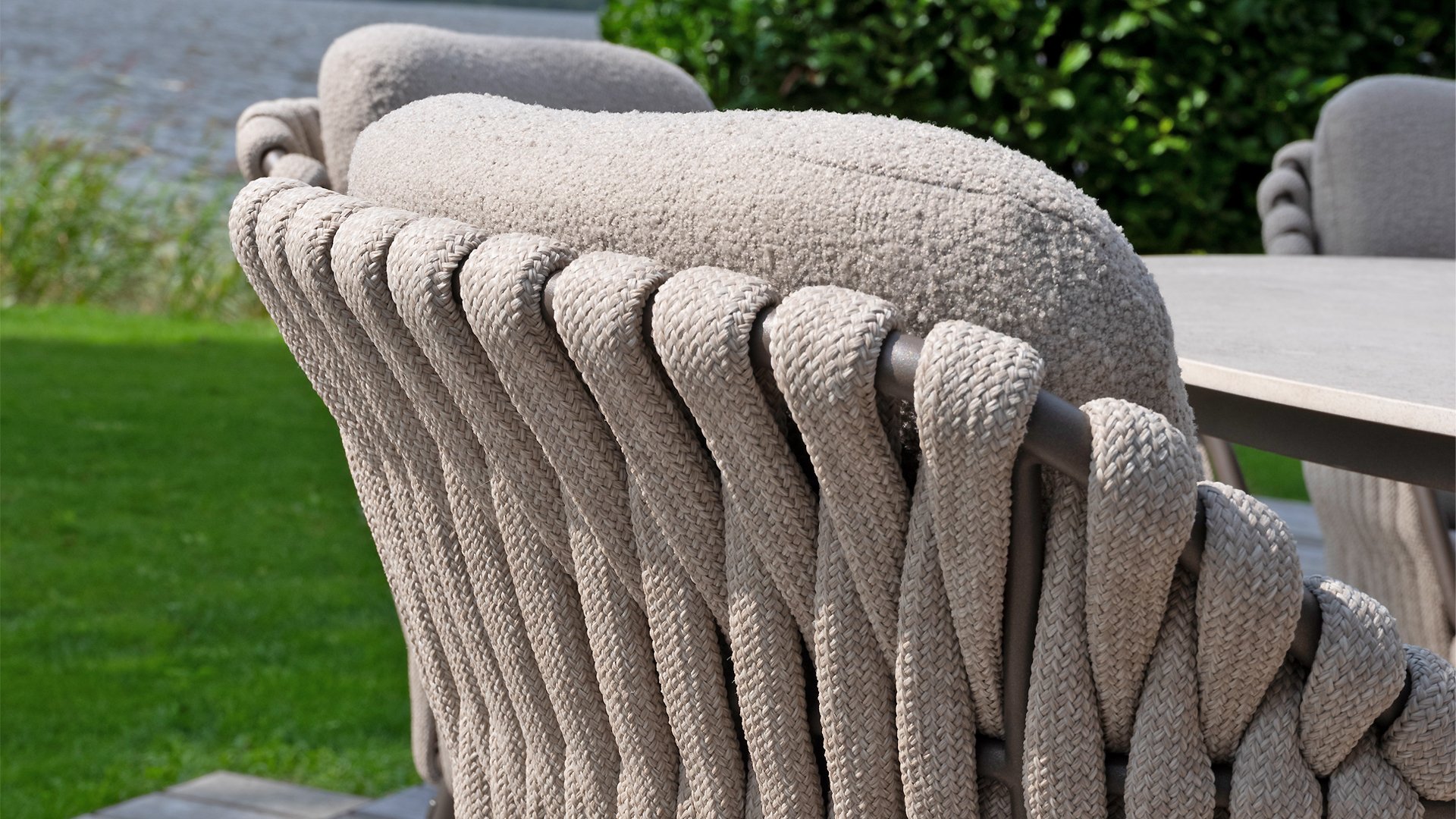 The 4 Seasons Outdoor Montera in the Terre color. It has a delightful seating comfort, soft colors, and a friendly design with a beautiful pattern of thick Rope thread. Unlike normal, the cushions in this series are Bouclé for a slightly more elegant look. Discover the perfect combination of comfort and design with the 4 Seasons Outdoor Montera dining chair.