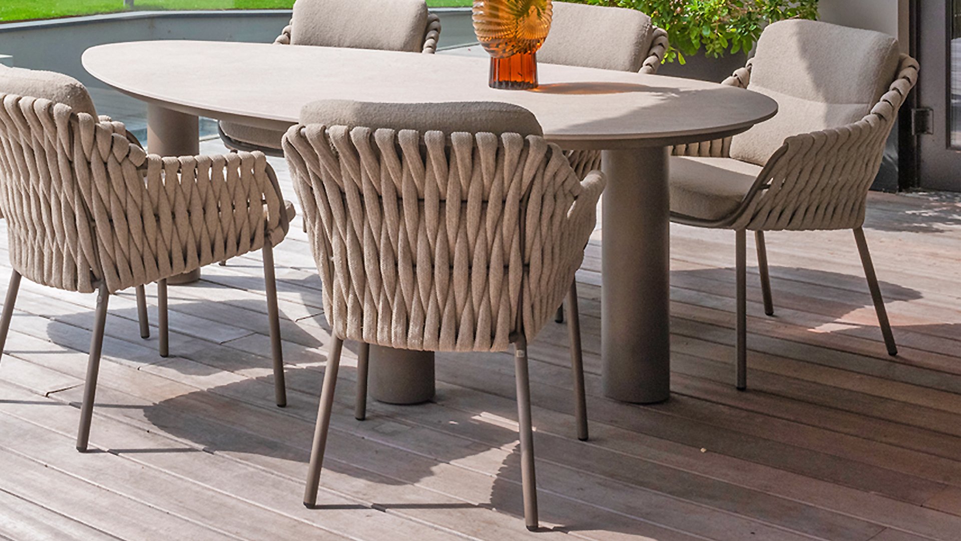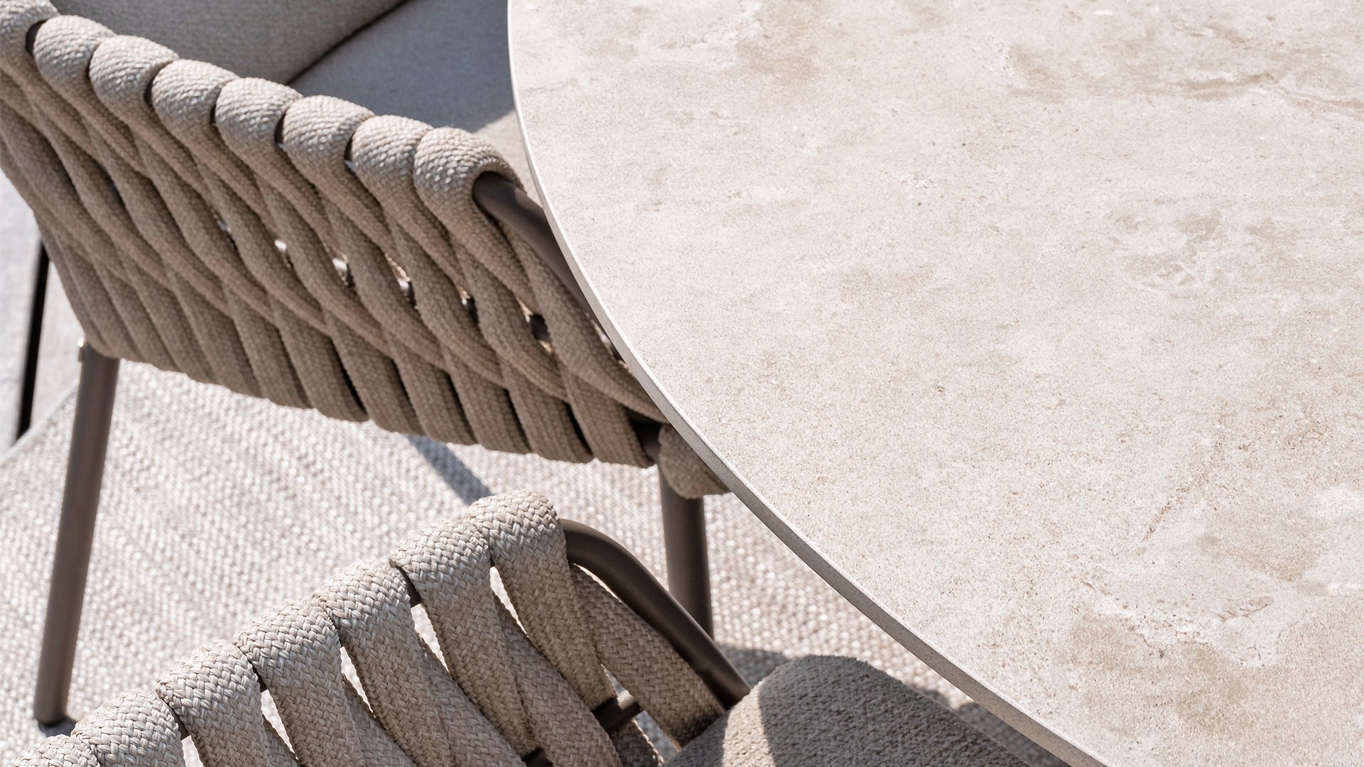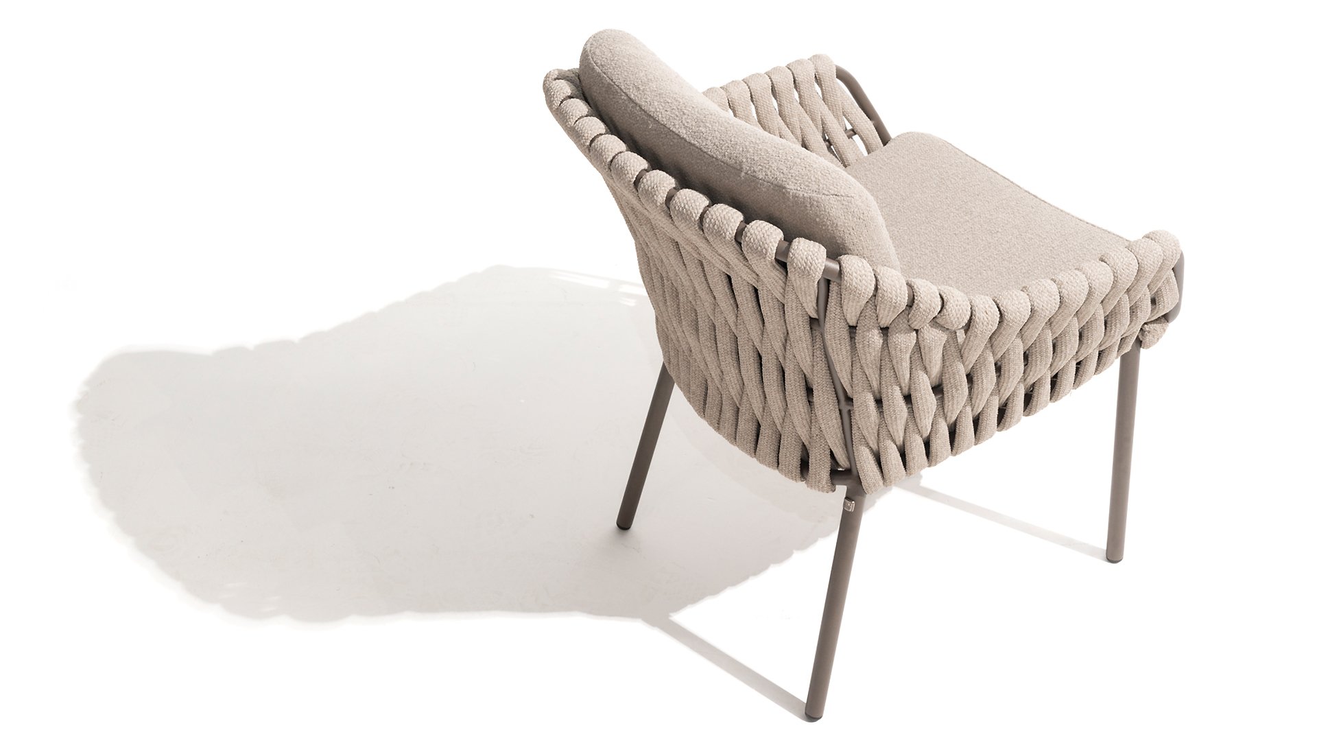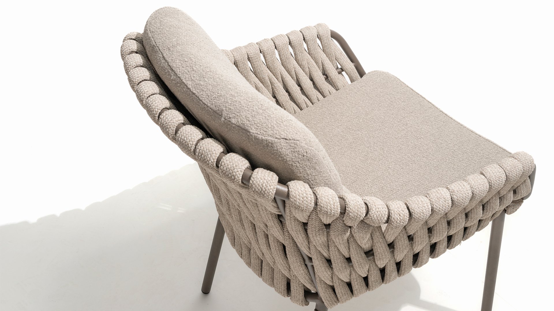 The 4 Seasons Outdoor Montera in the Terre color. It has a delightful seating comfort, soft colors, and a friendly design with a beautiful pattern of thick Rope thread. Unlike normal, the cushions in this series are Bouclé for a slightly more elegant look. Discover the perfect combination of comfort and design with the 4 Seasons Outdoor Montera dining chair.