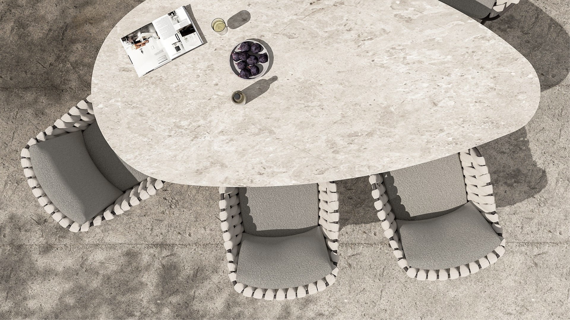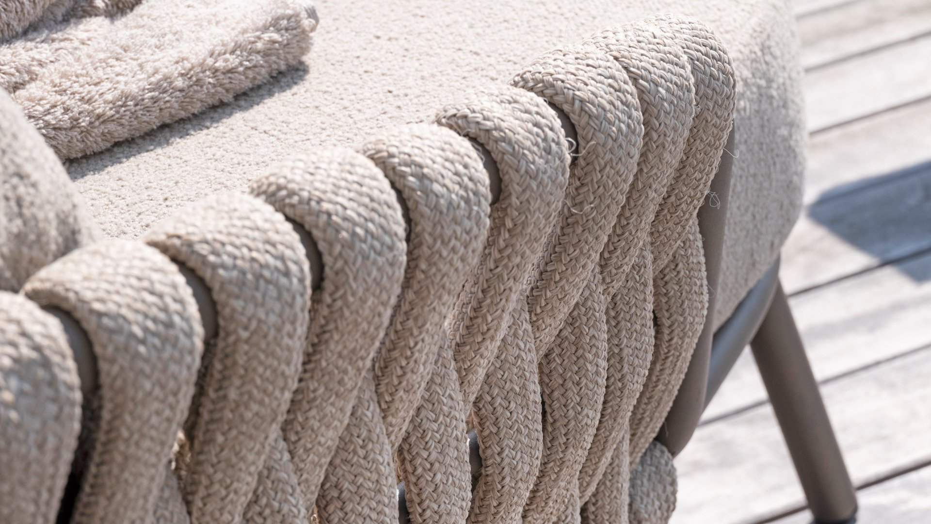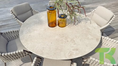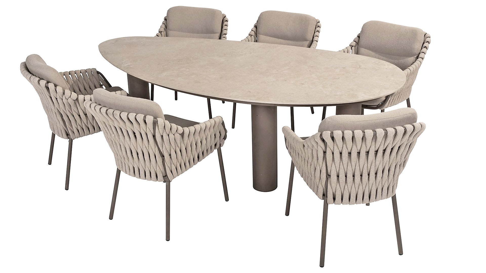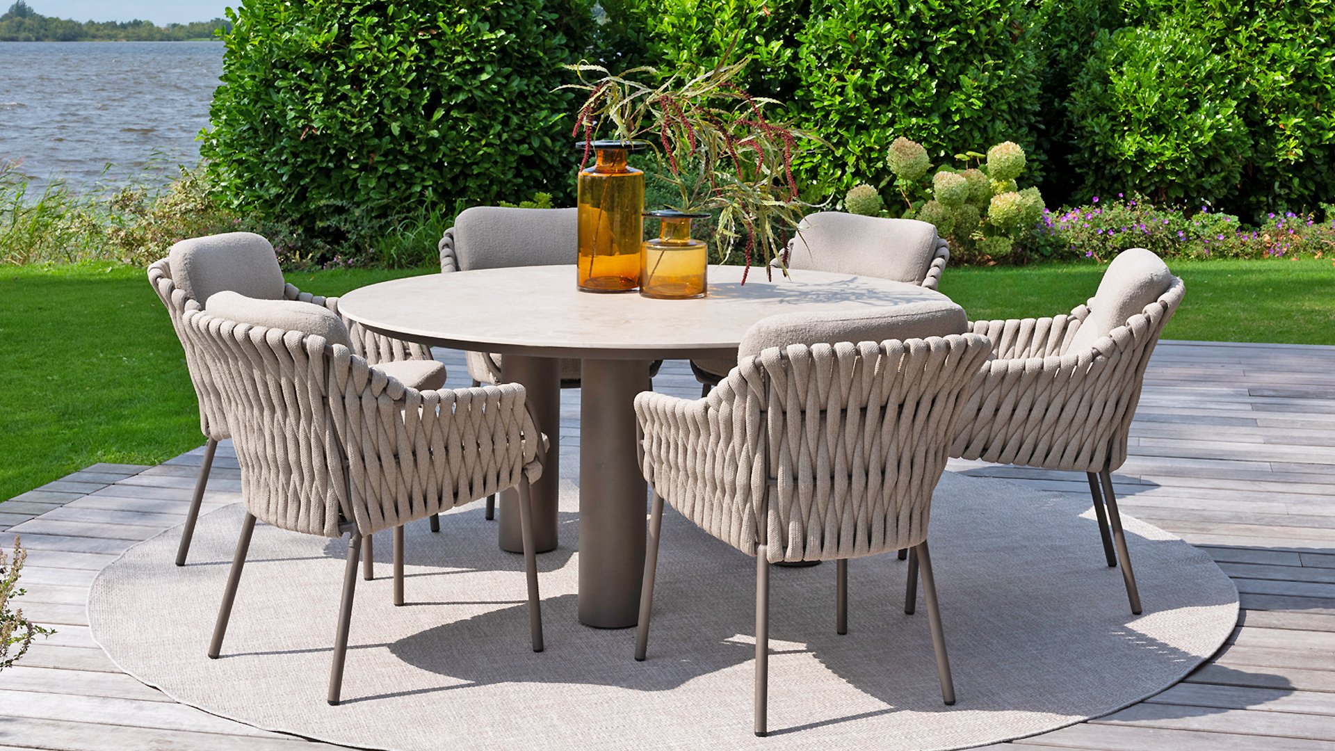 The 4 Seasons Outdoor Montera in the Terre color. It has a delightful seating comfort, soft colors, and a friendly design with a beautiful pattern of thick Rope thread. Unlike normal, the cushions in this series are Bouclé for a slightly more elegant look. Discover the perfect combination of comfort and design with the 4 Seasons Outdoor Montera dining chair.