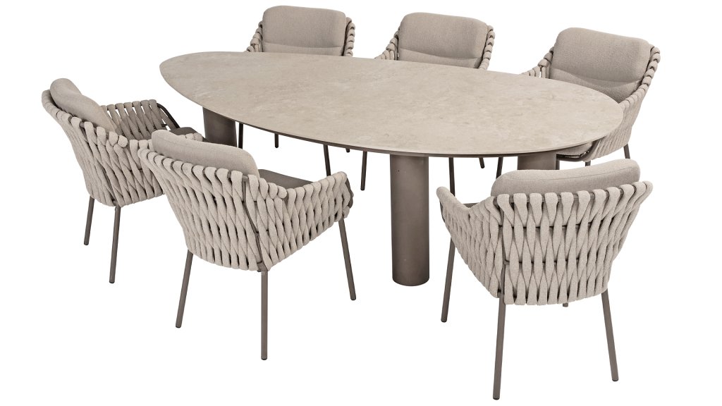 Meet the 4 Seasons Outdoor Montera Dining. Crafted with a stainless steel frame in the Terre color. The rope cord as well as the cushions are in the Clay color, with the cushion upholstery in Boucle for a change! This not only looks chic but also beautiful, trendy, and playful.