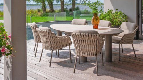 The shell is made of rope cord, which is not only stylish but also weather-resistant, making the chair perfect for use in the garden. The frame is powder-coated steel/aluminum in the Terre color, together with Taupe boucle cushions and Clay-colored rope cord, creating a cohesive and elegant whole. In addition to the dining chair, there is also a lounge version of the Montera, which is ideal for relaxing moments outdoors.