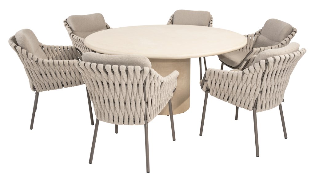 Meet the 4 Seasons Outdoor Montera Dining. Crafted with a stainless steel frame in the Terre color. The rope cord as well as the cushions are in the Clay color, with the cushion upholstery in Boucle for a change! This not only looks chic but also beautiful, trendy, and playful.