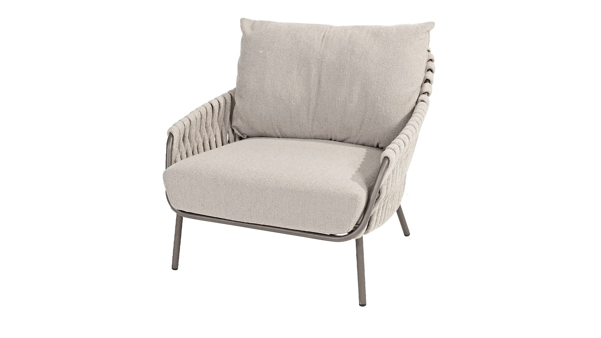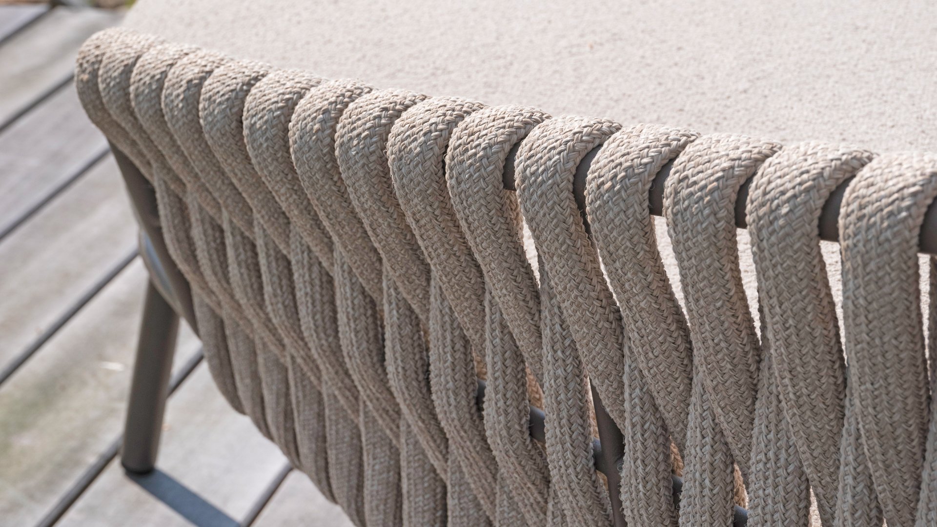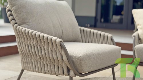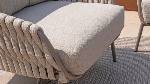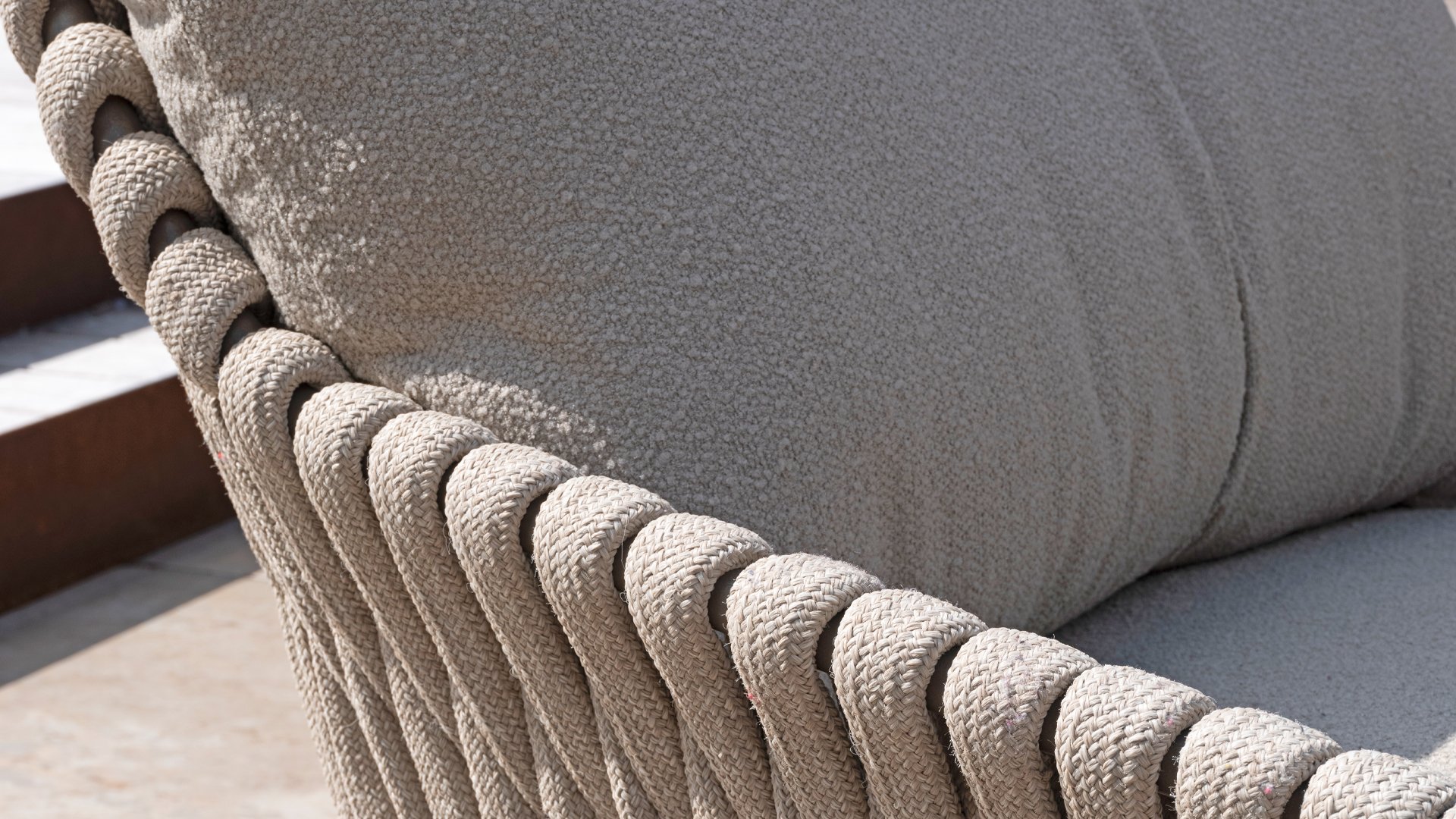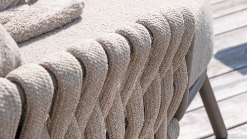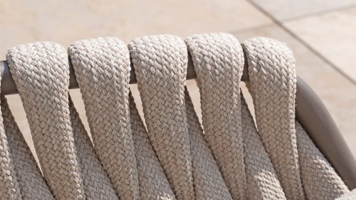 This beautiful material is perfect for outdoor use, because 4SO Rope is not just an shoelace. Our round wires have a synthetic core. This polypropylene base ensures minimal stretching of the rope and also does not absorb moisture. The covering is made of an acrylic fabric, similar to the weather-resistant fabric of our garden cushions. This covering feels soft but is highly water-repellent, UV-resistant, and colorfast. The flat rope variants have the same mix of weather-resistant materials, but the polypropylene material is interwoven with the acrylic fabric. This technique gives the flat rope the same properties but a completely different look. The stretch is minimal, and 4 Seasons Outdoor garden furniture with Rope is suitable for people weighing up to 110 kg. It's therefore an exceptionally strong material, but it's important to be careful with sharp objects. Our  Rope is weather-resistant, but a sharp object can seriously damage your garden furniture. We offer exclusive designs using hand-woven Rope patterns and techniques.