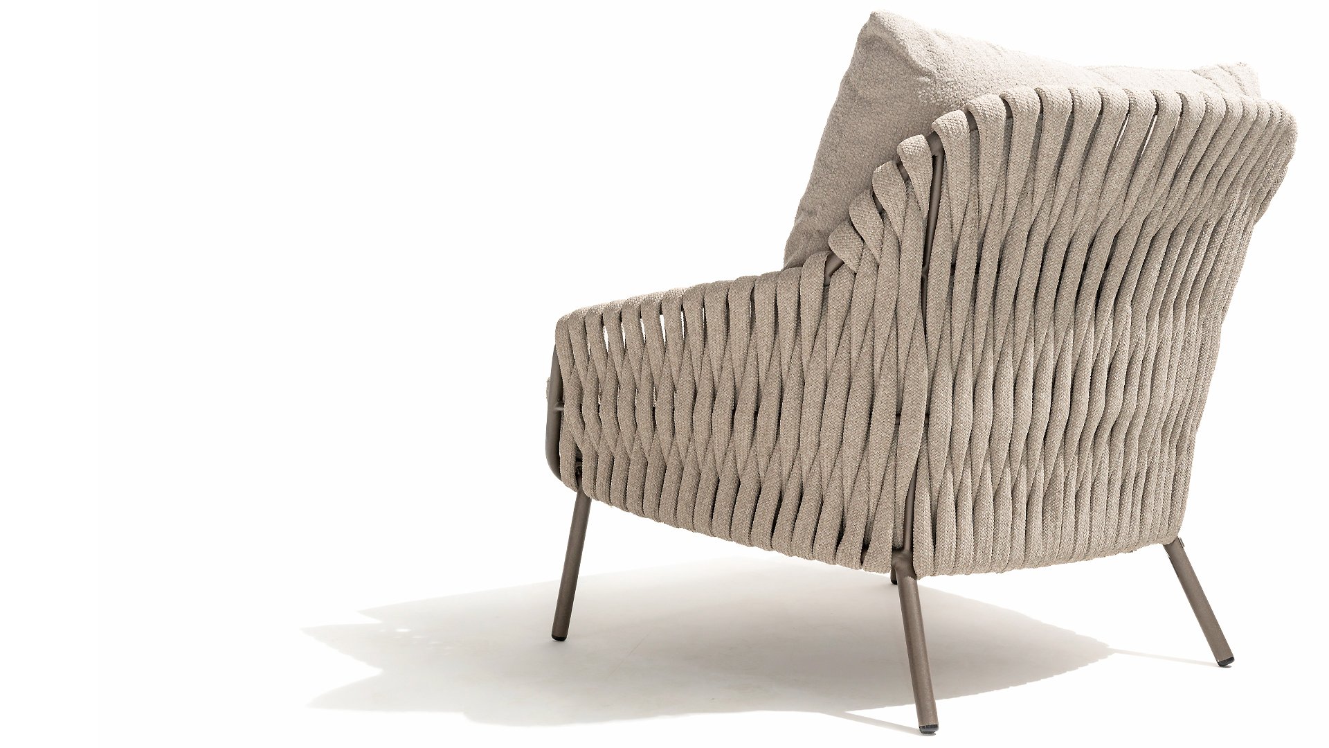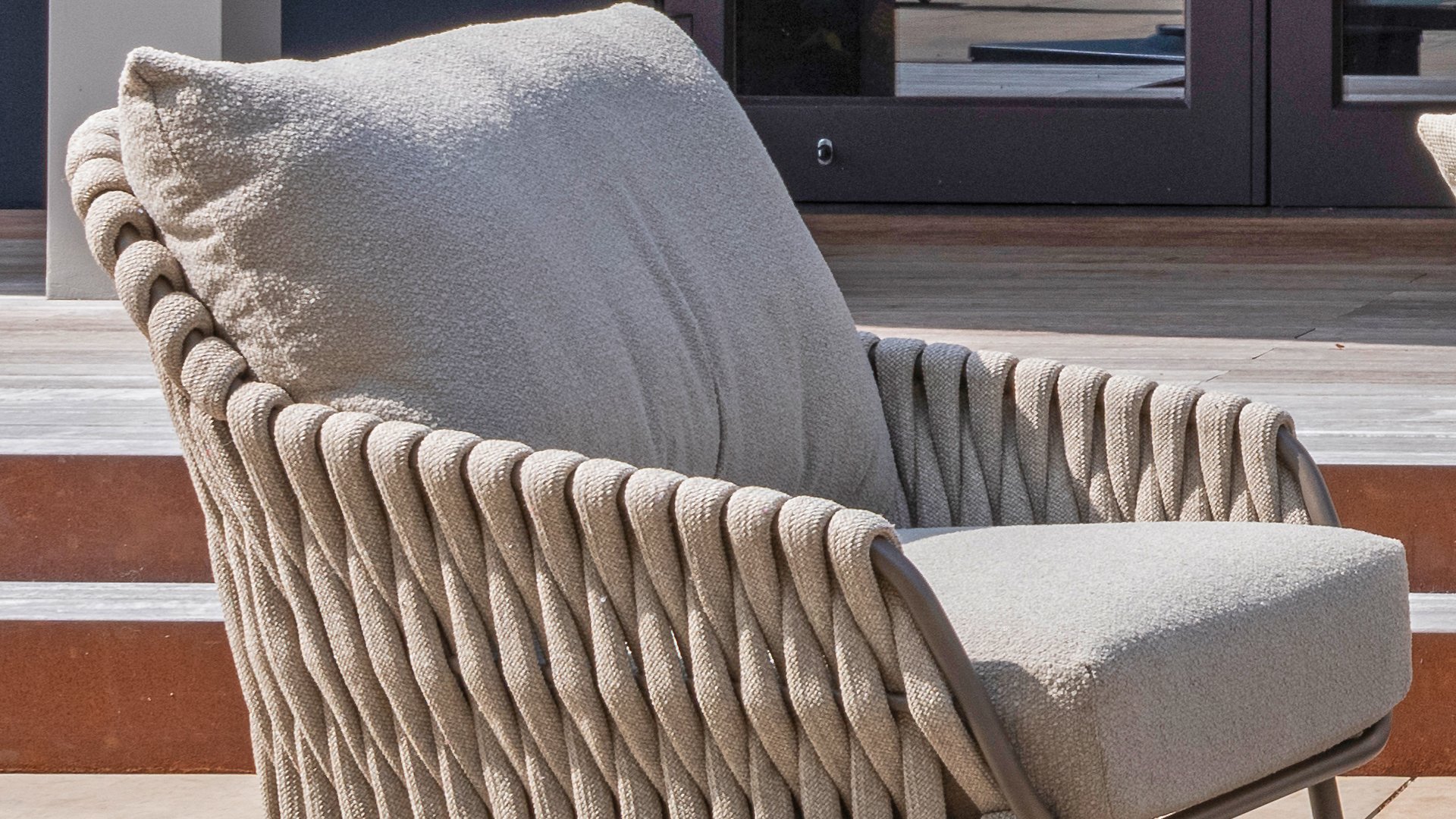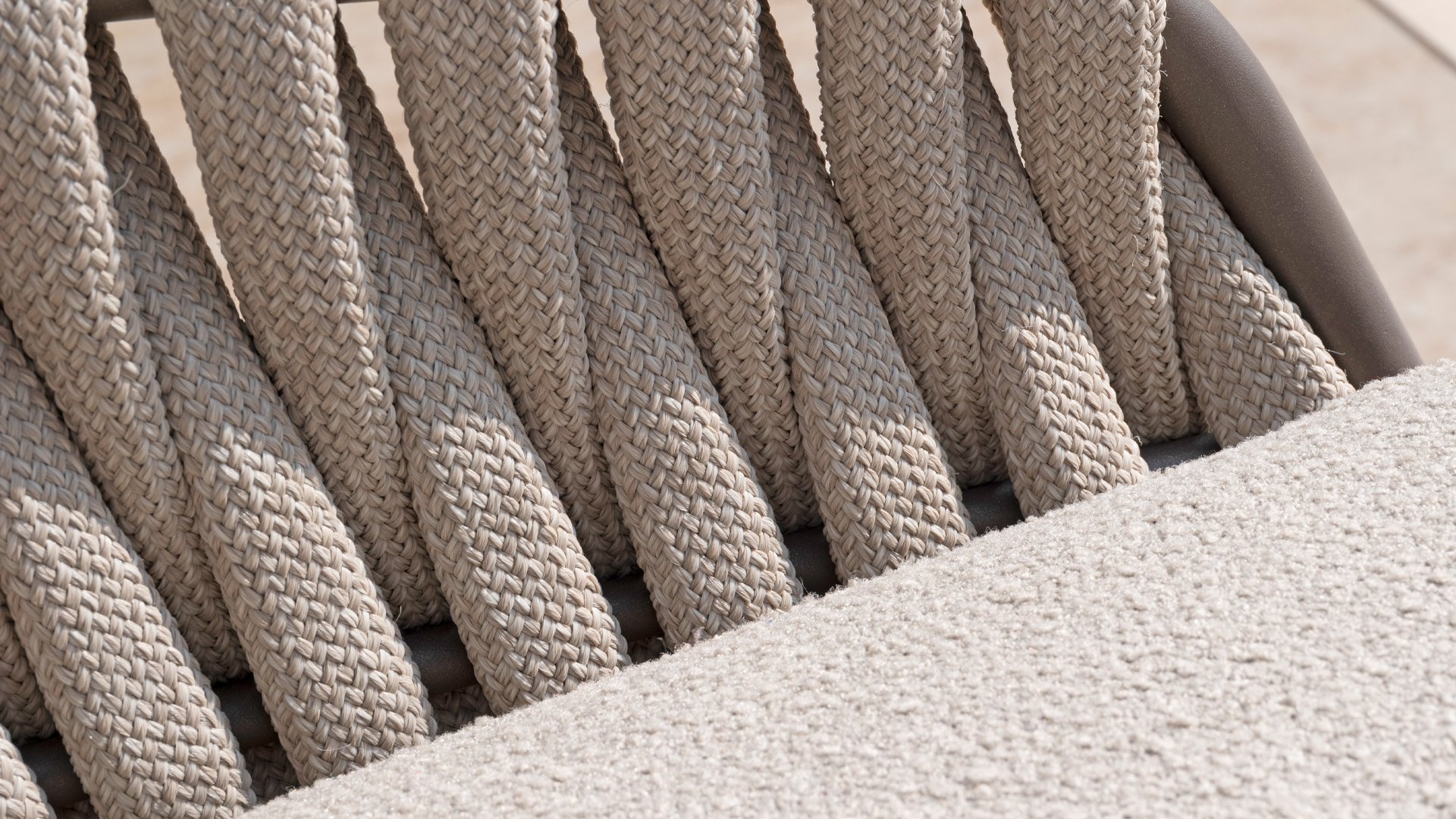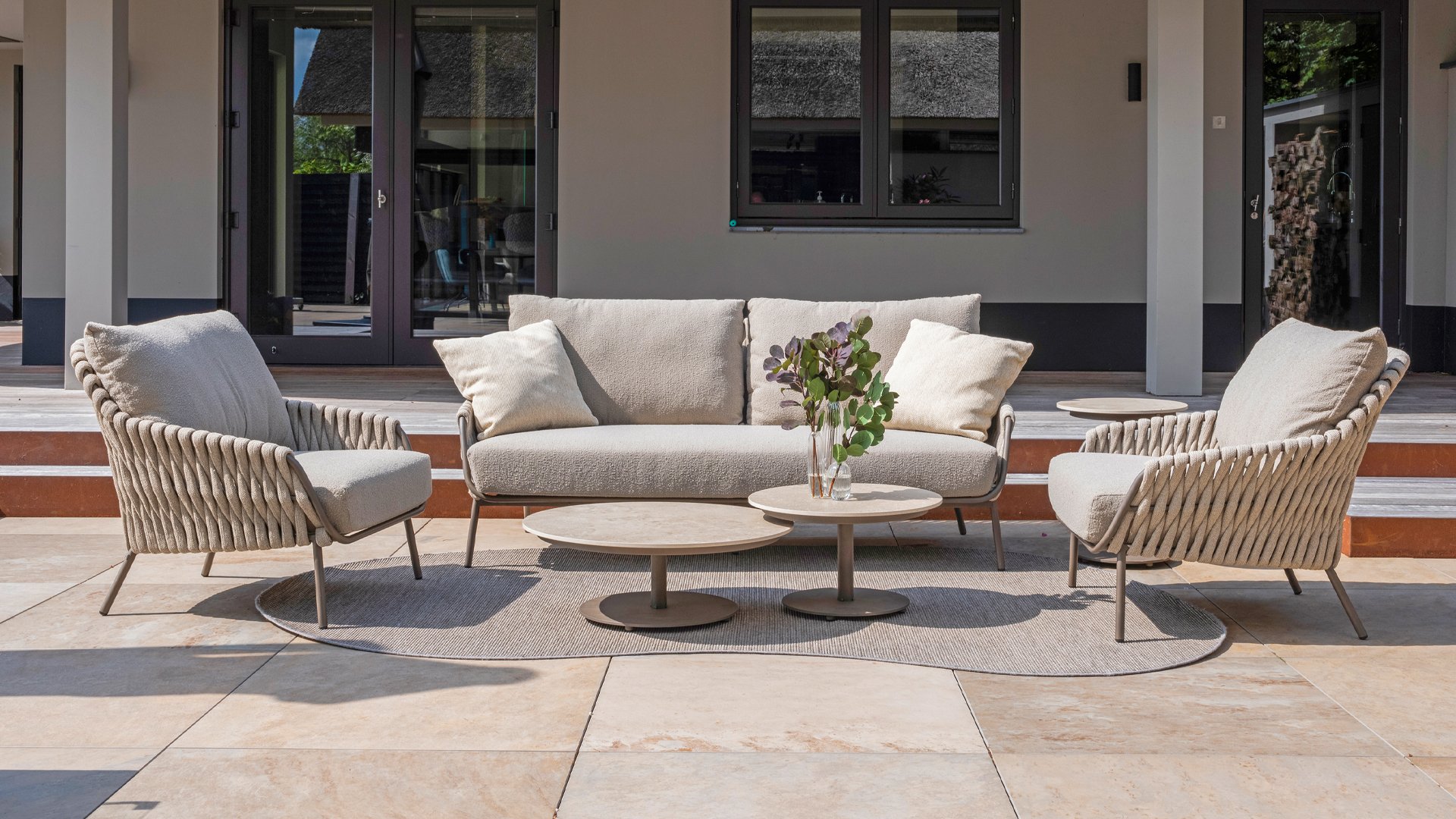 This beautiful material is perfect for outdoor use, because 4SO Rope is not just an shoelace. Our round wires have a synthetic core. This polypropylene base ensures minimal stretching of the rope and also does not absorb moisture. The covering is made of an acrylic fabric, similar to the weather-resistant fabric of our garden cushions. This covering feels soft but is highly water-repellent, UV-resistant, and colorfast. The flat rope variants have the same mix of weather-resistant materials, but the polypropylene material is interwoven with the acrylic fabric. This technique gives the flat rope the same properties but a completely different look. The stretch is minimal, and 4 Seasons Outdoor garden furniture with Rope is suitable for people weighing up to 110 kg. It's therefore an exceptionally strong material, but it's important to be careful with sharp objects. Our  Rope is weather-resistant, but a sharp object can seriously damage your garden furniture. We offer exclusive designs using hand-woven Rope patterns and techniques.