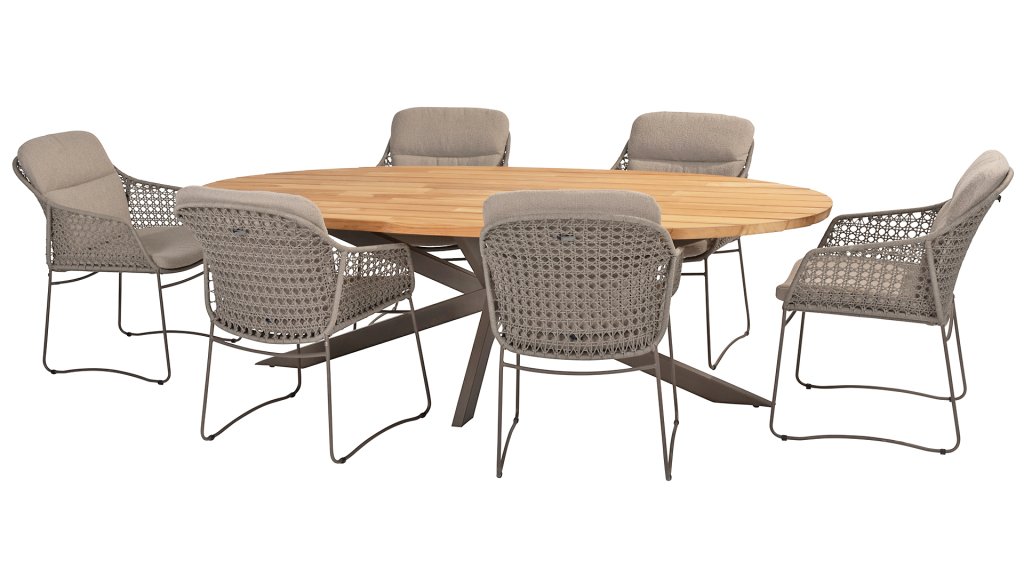 The Taste by 4Seasons Prado Ellips can rightfully be called a work of art. Just look at how artistically that leg structure is put together. The thick teak wood top has a slanted edge and gives the table a light feel. Can be combined with our entire collection of garden chairs. Available with anthracite, teak, latte, or terre base:
