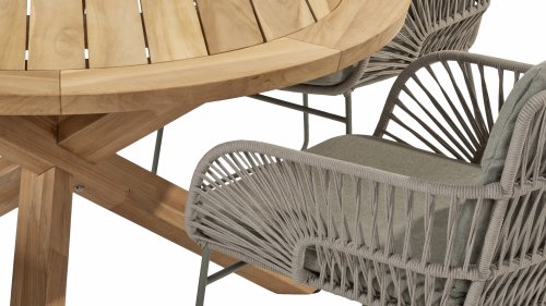 This beautiful material is perfect for outdoor use, because 4SO Rope is not just an shoelace. Our round wires have a synthetic core. This polypropylene base ensures minimal stretching of the rope and also does not absorb moisture. The covering is made of an acrylic fabric, similar to the weather-resistant fabric of our garden cushions. This covering feels soft but is highly water-repellent, UV-resistant, and colorfast. The flat rope variants have the same mix of weather-resistant materials, but the polypropylene material is interwoven with the acrylic fabric. This technique gives the flat rope the same properties but a completely different look. The stretch is minimal, and 4 Seasons Outdoor garden furniture with Rope is suitable for people weighing up to 110 kg. It's therefore an exceptionally strong material, but it's important to be careful with sharp objects. Our Rope is weather-resistant, but a sharp object can seriously damage your garden furniture. We offer exclusive designs using hand-woven Rope patterns and techniques.