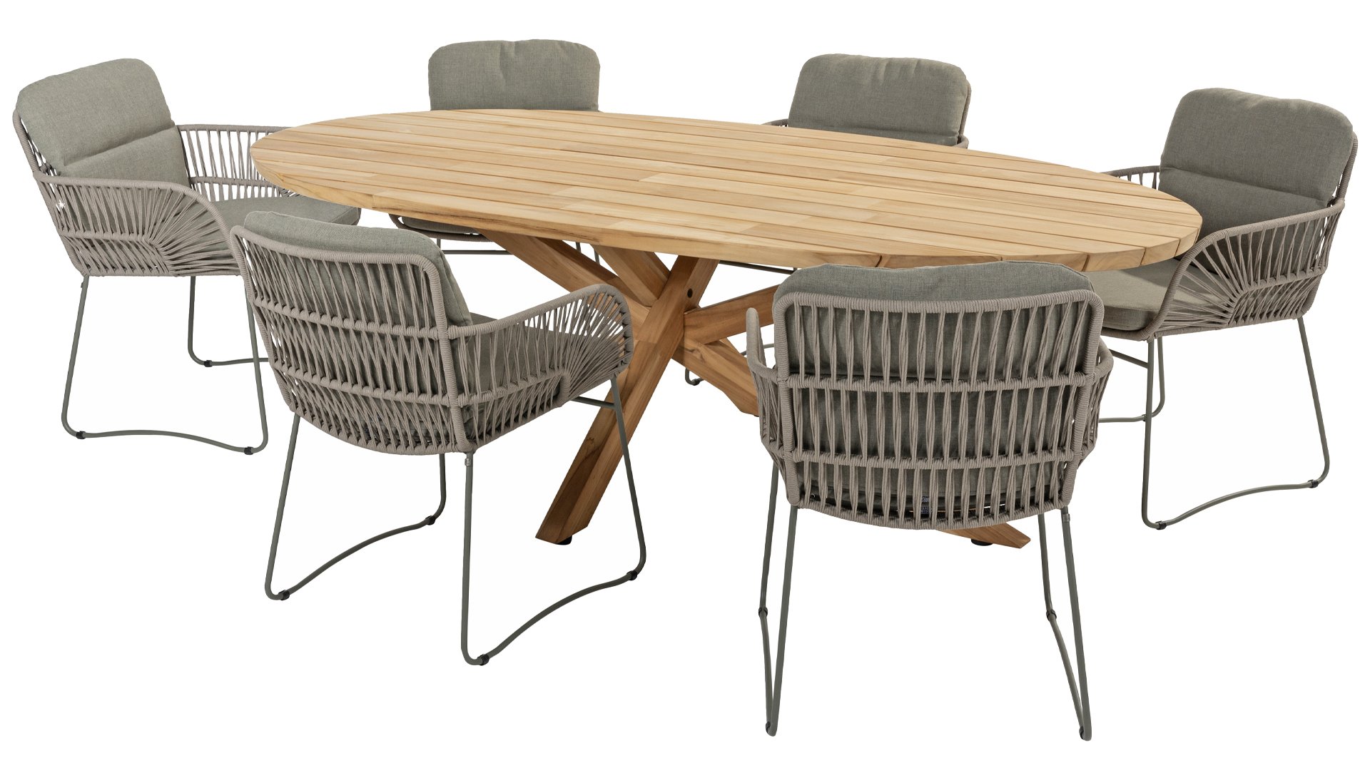 6 x 4Seasons Murcia dining chair olive 1 x Taste Prado Ellips table 240x115cm Teak-Teak Dim. Set: ± 249x260x86cm (LxWxH)