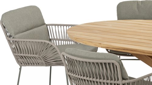 This beautiful material is perfect for outdoor use, because 4SO Rope is not just an shoelace. Our round wires have a synthetic core. This polypropylene base ensures minimal stretching of the rope and also does not absorb moisture. The covering is made of an acrylic fabric, similar to the weather-resistant fabric of our garden cushions. This covering feels soft but is highly water-repellent, UV-resistant, and colorfast. The flat rope variants have the same mix of weather-resistant materials, but the polypropylene material is interwoven with the acrylic fabric. This technique gives the flat rope the same properties but a completely different look. The stretch is minimal, and 4 Seasons Outdoor garden furniture with Rope is suitable for people weighing up to 110 kg. It's therefore an exceptionally strong material, but it's important to be careful with sharp objects. Our  Rope is weather-resistant, but a sharp object can seriously damage your garden furniture. We offer exclusive designs using hand-woven Rope patterns and techniques.