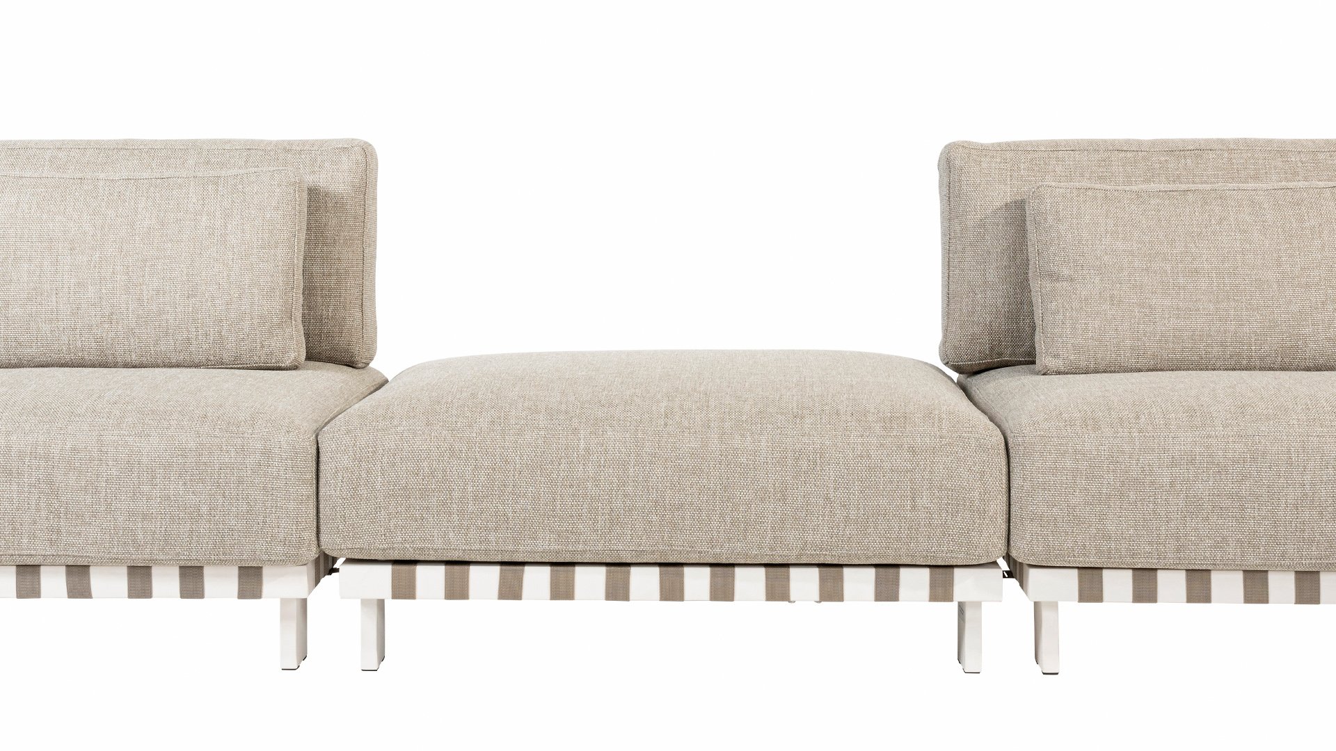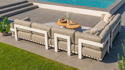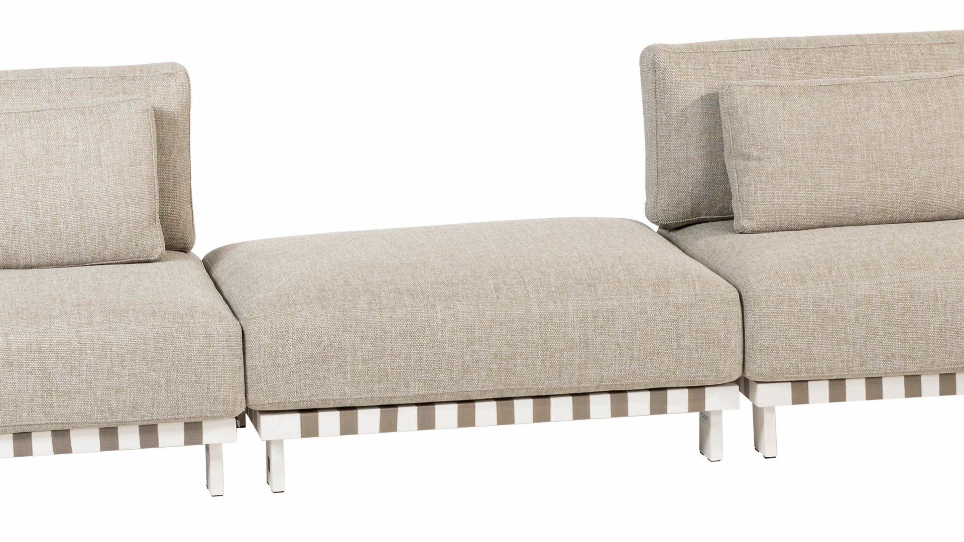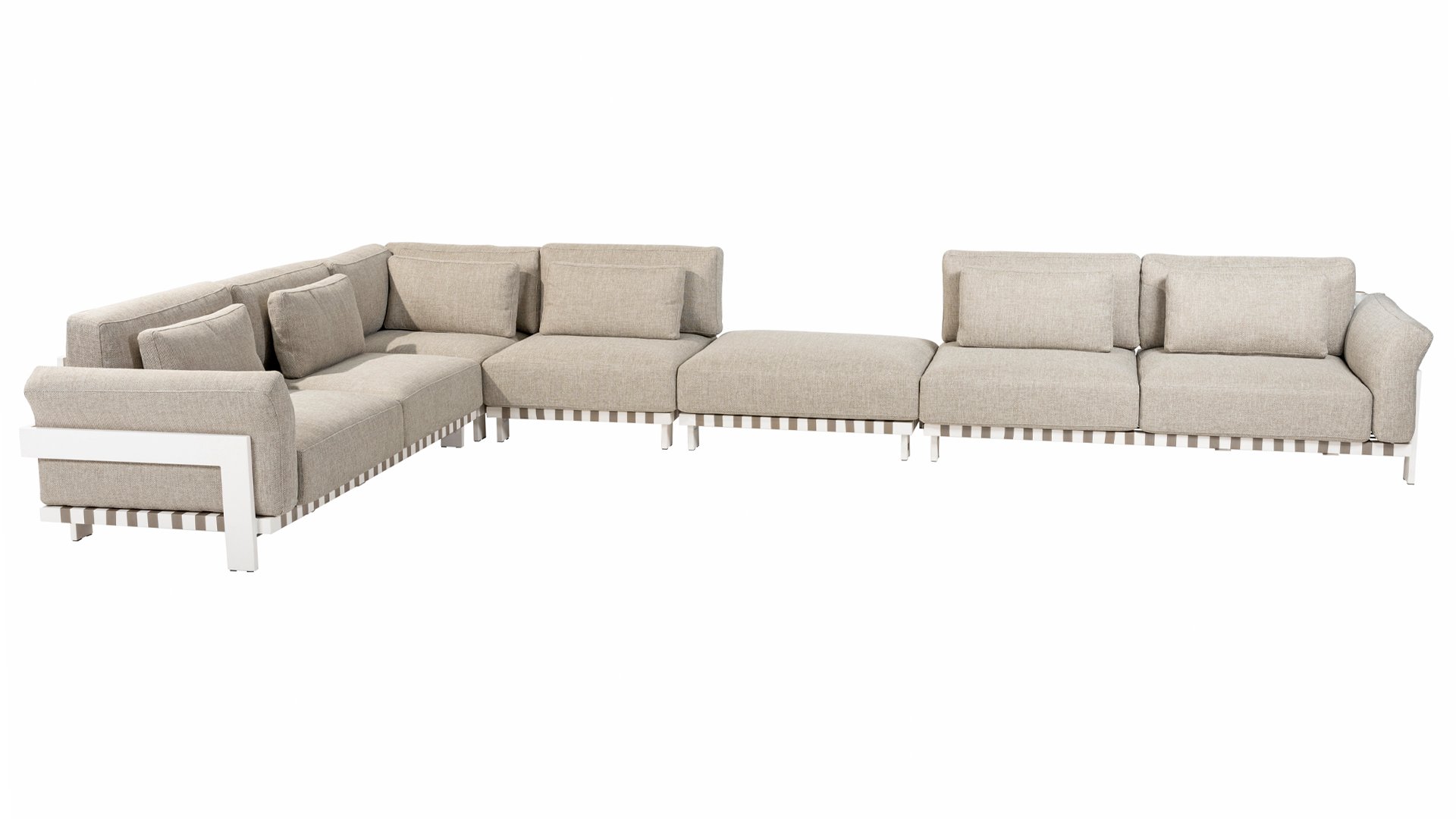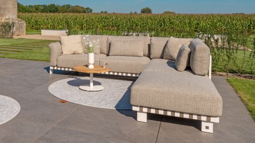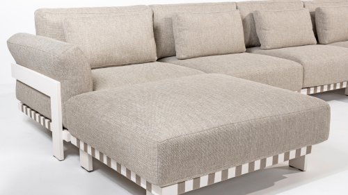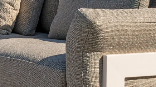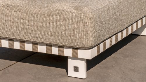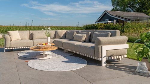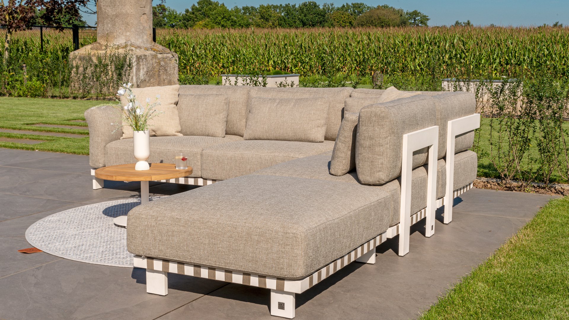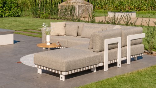 Ultimate comfort and design, without much maintenance? Then go for the 4 Seasons Outdoor Paloma lounge set. The 4SO Paloma has a white aluminum frame, with light beige colored cushions. The corner sofa comes with lumbar cushions for extra seating comfort. The arm cushions are slightly curved, allowing them to fall over the frame so you can rest your arm comfortably, or your head so you can lie back nicely on this Paloma corner sofa. The frame is equipped with webbing, which makes the seating comfort even more enjoyable. The webbing gives a little when you sit (down) or shift your position.