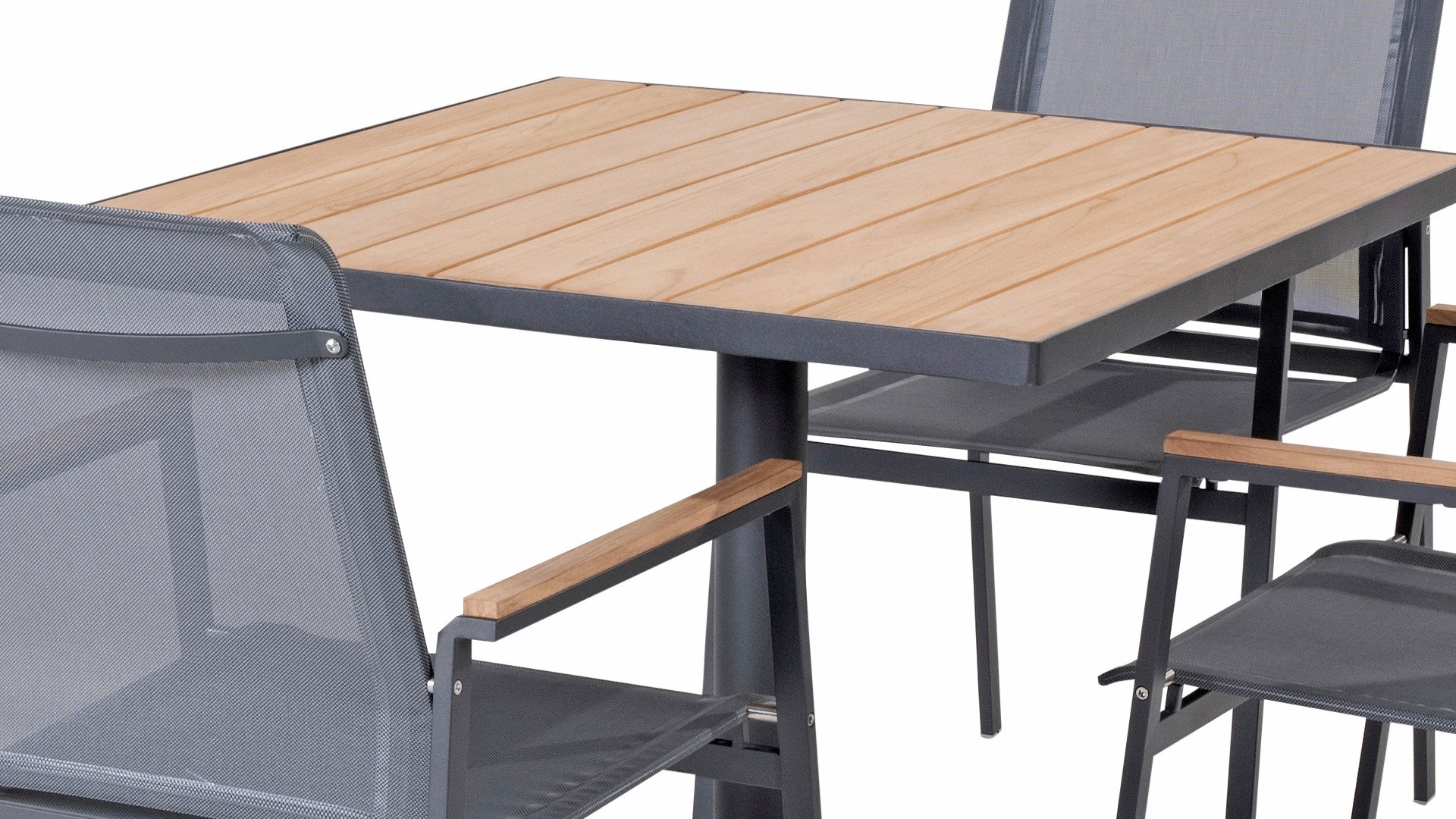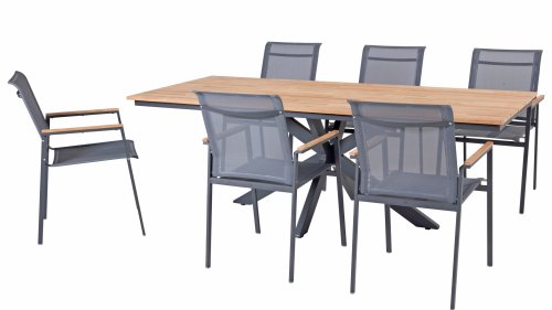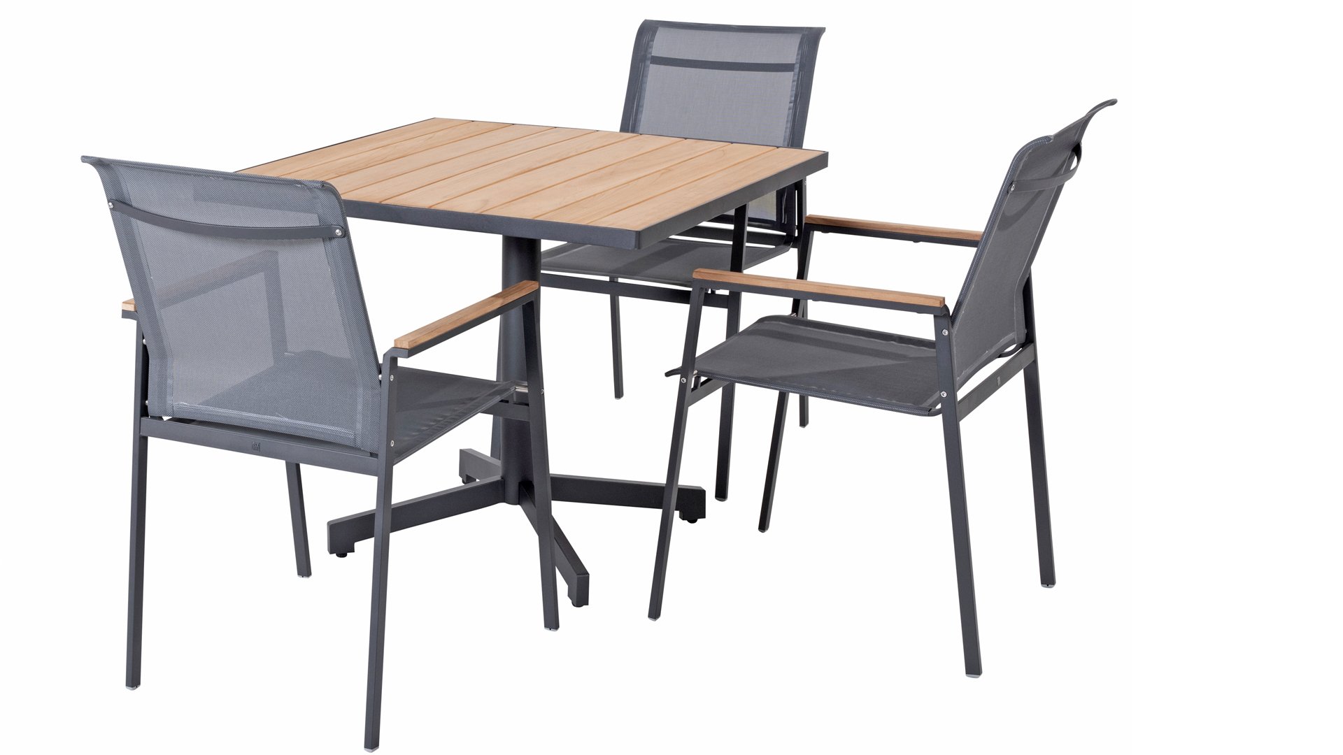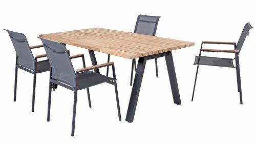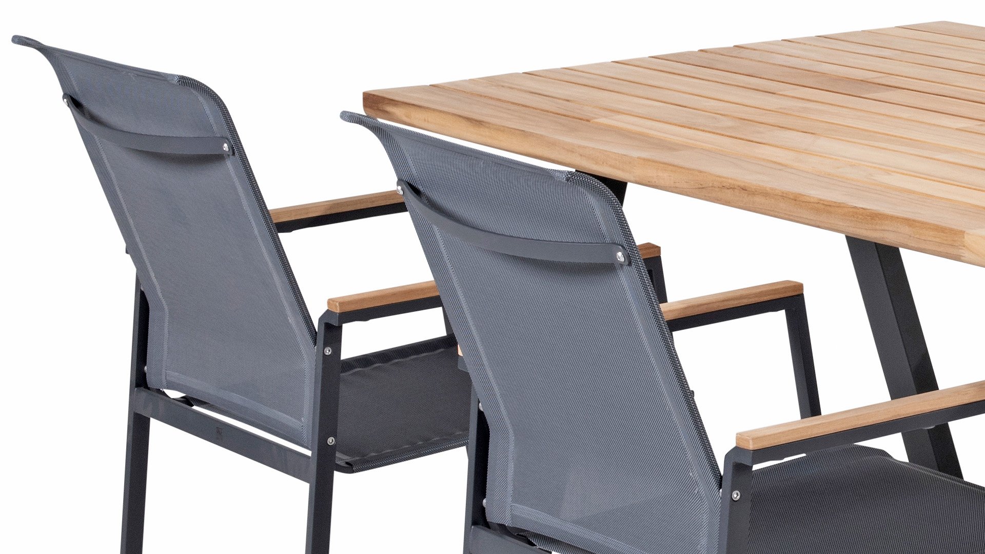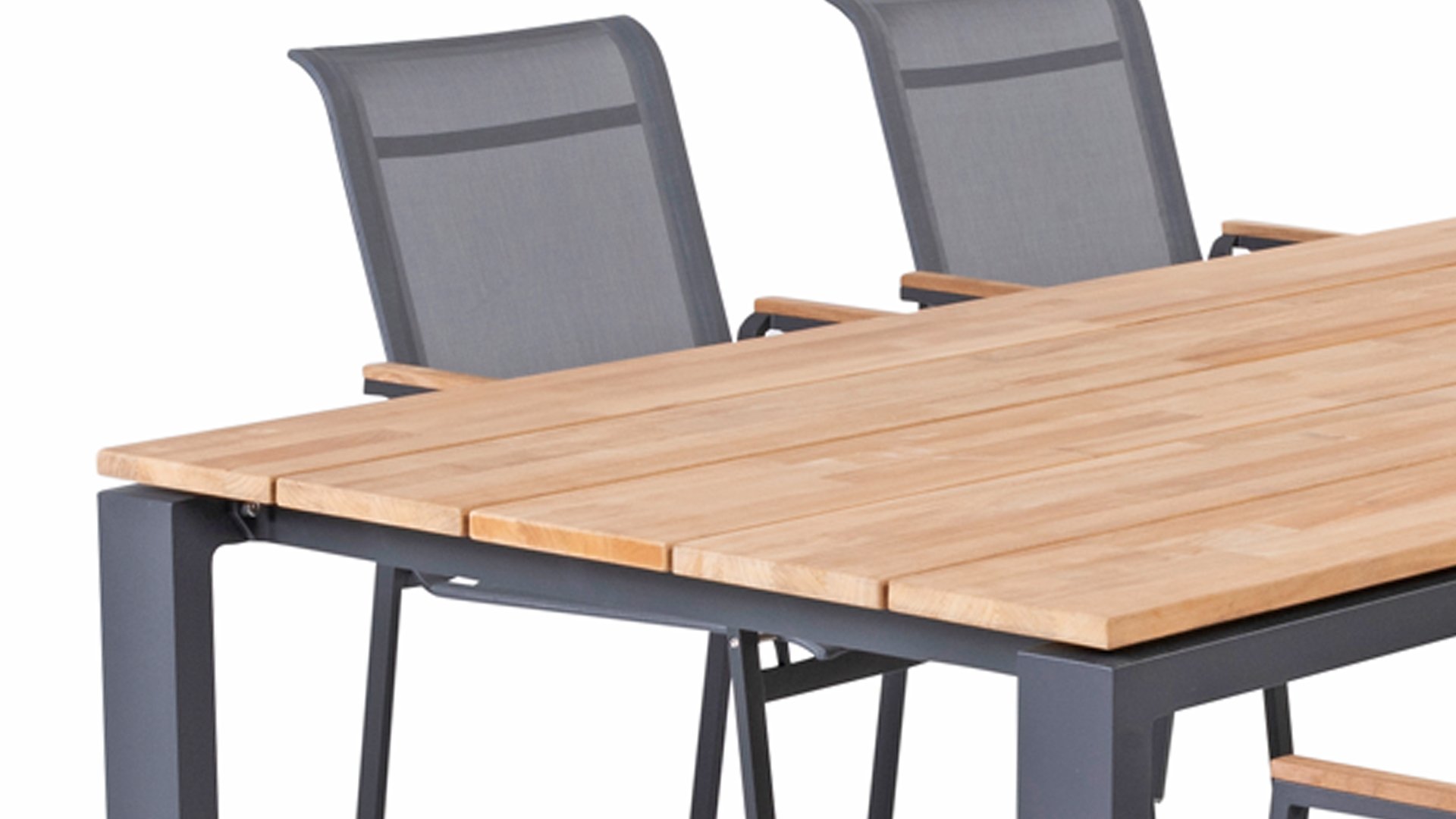 The Passion stackable chair has an anthracite powder-coated stainless steel frame and a textile seat and back. The armrest feels comfortable due to the teak accents, making it a beautiful combination with a garden table with an anthracite base and a teak table top. To give an example: The 4 Seasons Outdoor Goa garden table and Passion stackable chairs are a great combination!